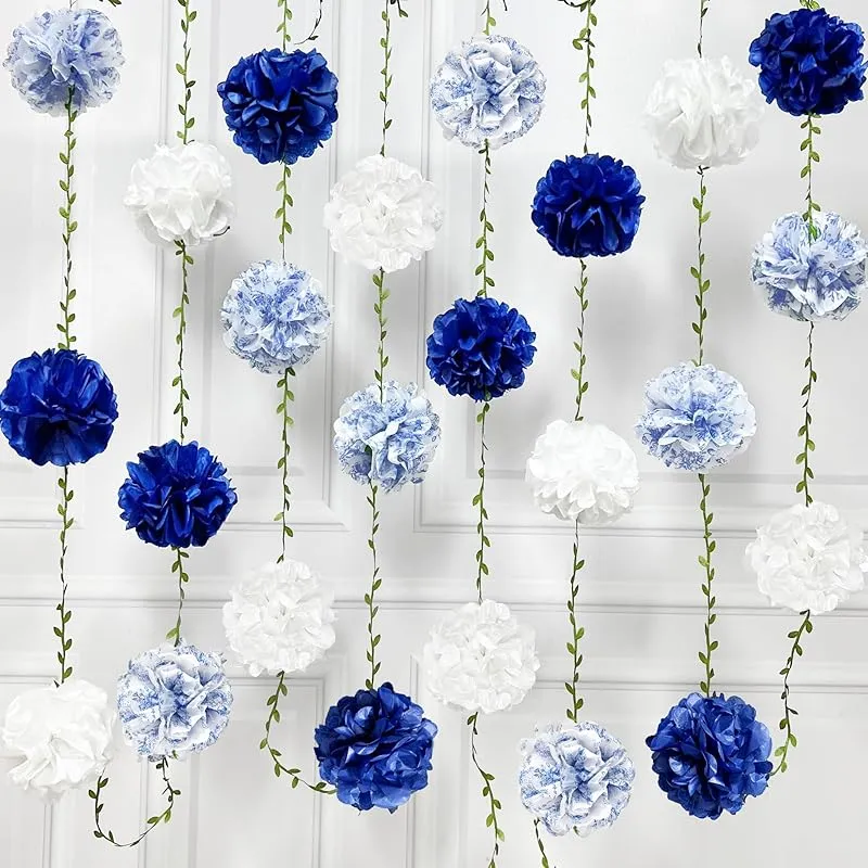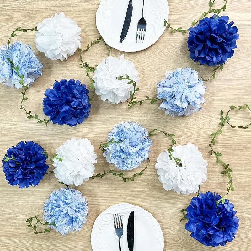 【新品】 pinkblume 青と白の花柄のお花紙ポンポンストリーマーのパーティー装飾 ブルーホワイトのティッシュペーパーフラワーポンポン緑葉のリボン吊り下げガーランド 天井の装飾 誕生日飾り付け 100日祝い出産祝い結婚式 シノワズリをテーマにしたパーティー