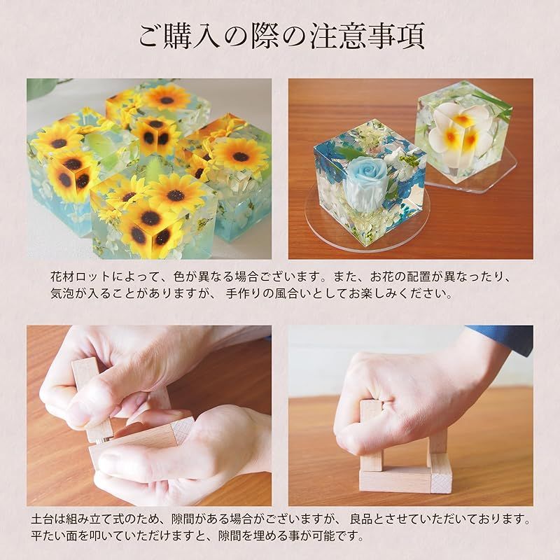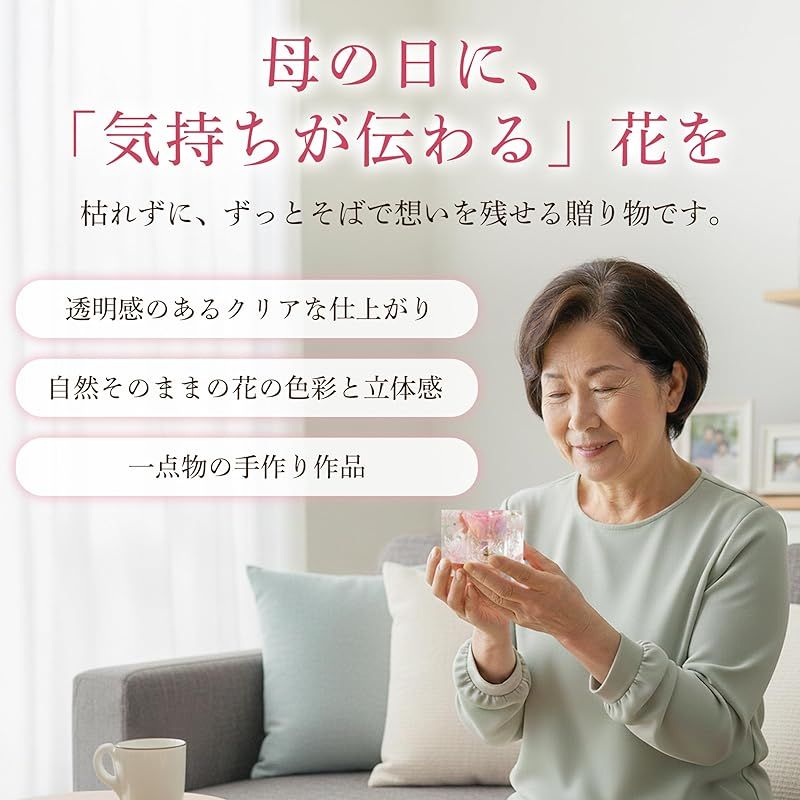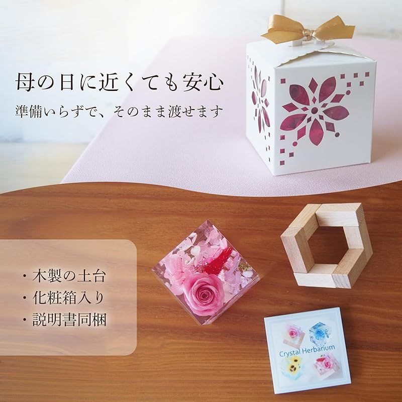 【光を受けてきらめくクリスタルハーバリウム】生き生きとしたプリザーブドフラワーやアーティフィシャルフラワーと高透明シリコン樹脂の輝きと融合し、インテリアに上品な彩りを添えます。