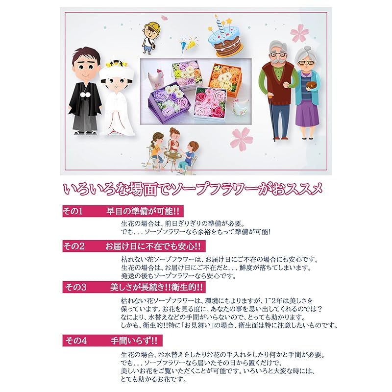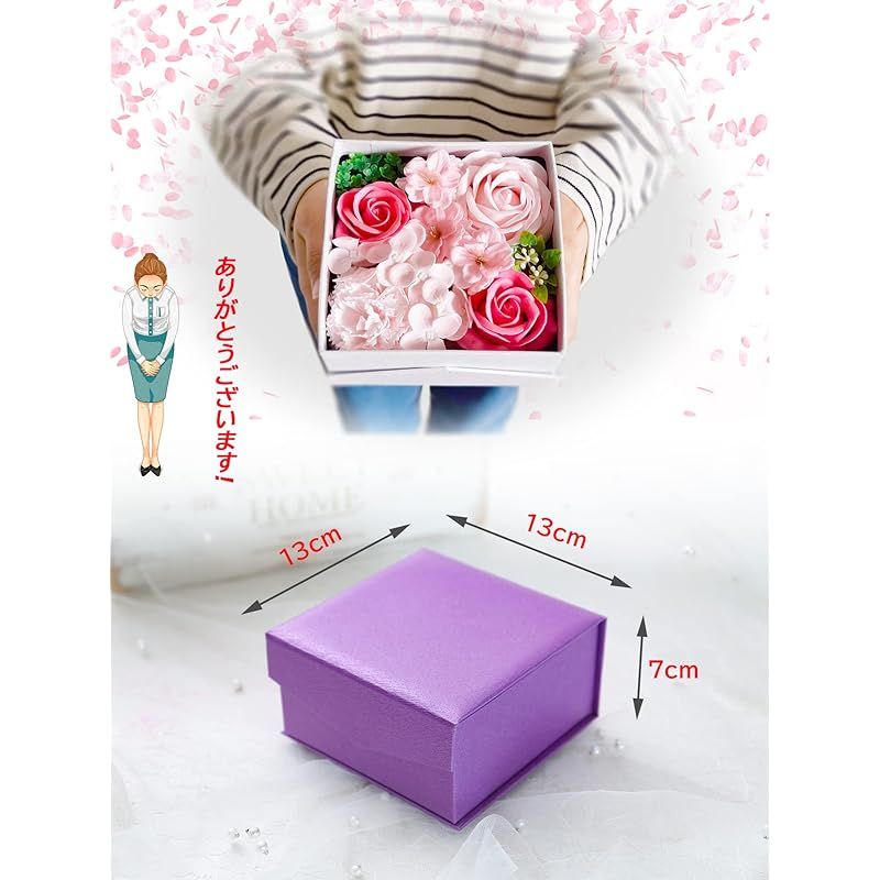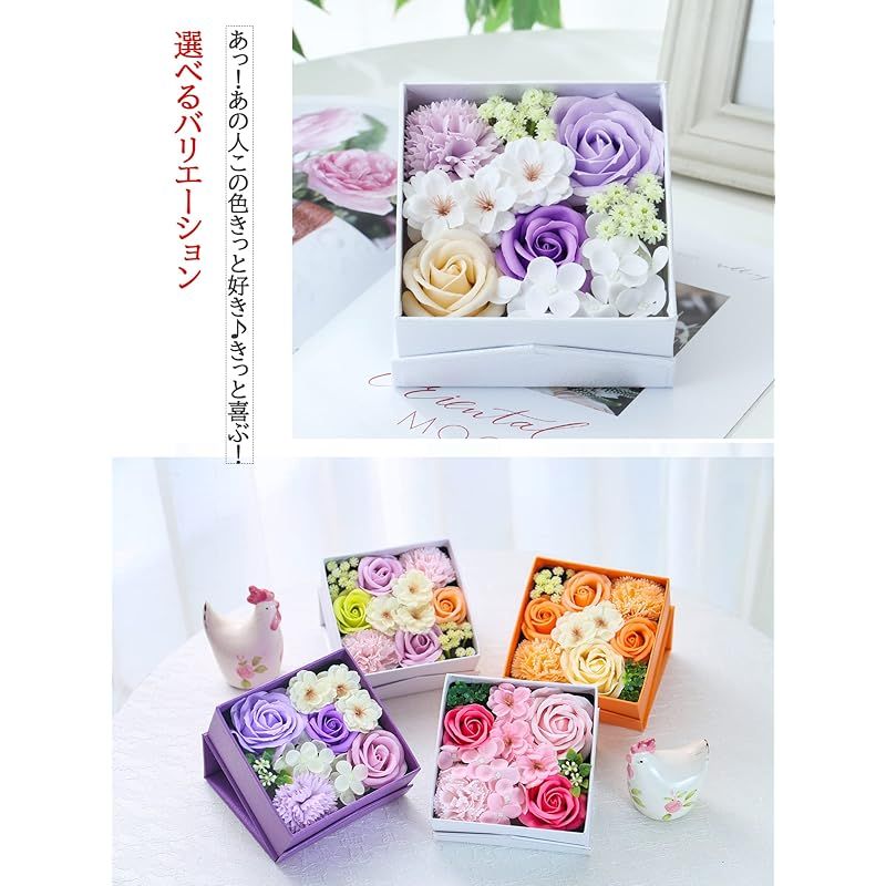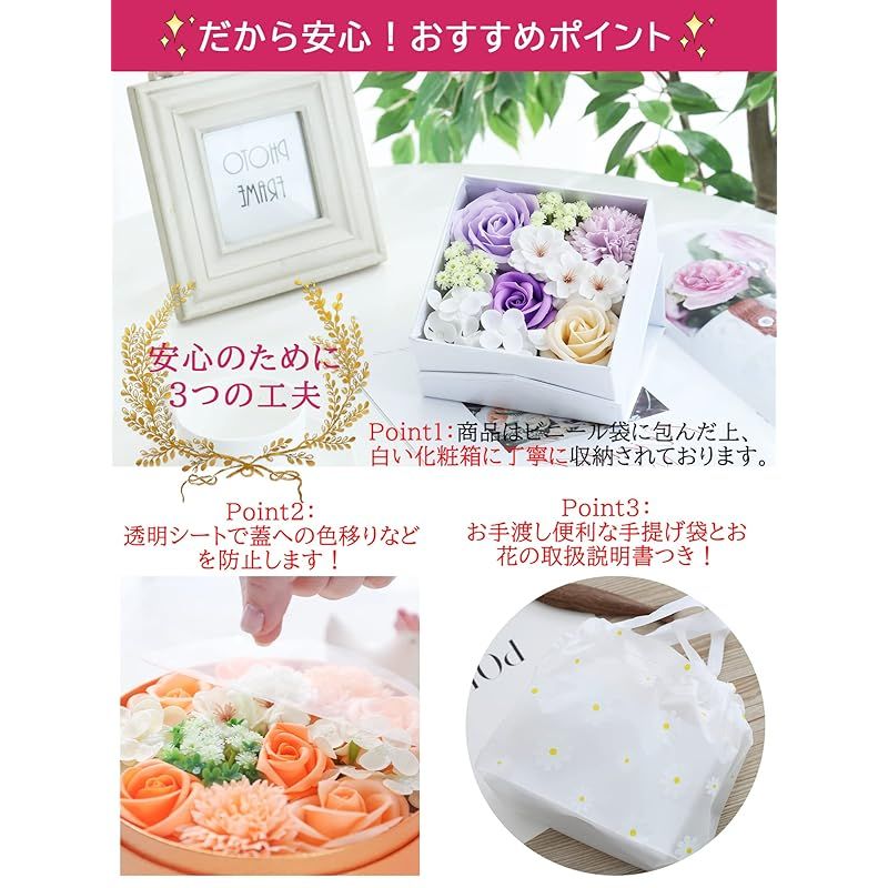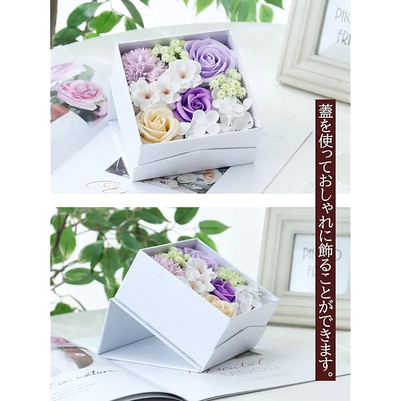 【商品概要】 ソープフラワー プレゼントに大人気:ソープフラワーとは、石験から作られた観賞用のお花です。水やりの必要もなく、枯れない花なので、美しさを保ったまま長く飾っていただくことが可能です。フラワーアレンジメントとしてお花の種類も豊富で、ローズを中心に、カーネーション、バラ、紫陽花、桜などたくさんの種類のお花をぎゅっと詰め込みました!お値段の割に豪華です。母の日のプレゼント、誕生日プレゼント、結婚祝い、卒業式など様々なシチュエーションにピッタリです! 感謝やお祝いの事の贈り物として目を引くおしゃれグッズです。 おしゃれに飾る・完全ハンドメイド:蓋を使っておしゃれに飾ることができます。インテリア飾りとしてもおくりものとしてもその場を綺麗で可愛い空間にしてくれます。精巧なギフトボックスはサプライズの始まりです!また、当店のソープフラワーはお花だけではなく、ボックスまで完全手作りしたものです!職人による一個ずつ手作りした花箱は、機械で量産されているボックスの欠点(多少の傷や雑感など)を最大限に避けられます! 丁寧に梱包:心を込めた大事な商品が、当店は丁寧に梱包しております。Point 1:商品はビニール袋に包んだ上、白い化粧箱に収納されております。Point 2:透明シールで蓋への色移りなどを防止します。Point 3:お手渡し便利な手提げ袋付き!手渡し時にそのままお渡しできるように可愛い手提げ袋を同梱しております。Point 4:当店独自の取り扱い説明書を同梱しております。大切な人への贈り物として大変喜ばれています。 手間いらず・長く楽しむ:プリザーブドフラワーやハーバリウムよりコストパフォーマンスが高いため、フラワーギフトに大変人気となっております。高品質な石鹸素材で作られたお花は本物と見間違えるほど美しいですが、生花で問題視されている花粉、殺菌?殖、嫌な臭い、水やり、土の準備、植替えなどが一切ありません。また、お花が石験で作られているので、ほんのりといい香りをお楽しみいただけます。インテリアとしても、オシャレ芳香剤としても人気です。 色々なシーン:誕生日プレゼント ギフト 結婚祝い 入学式 還暦祝い 卒業祝い 退職祝い 贈り物 古希祝い プレゼント 誕生日 結婚記念日 卒業式 入学祝い 退職お礼品 米寿 プチギフト 開店祝い 記念品 お供え 送別品 おくりもの お見舞い デート 昇進 転居 ウェディング装飾 発表会 送別会 プロポーズ 出産祝い パーティー 忘年会 新年会 新築祝い 敬老祝い 喜寿 引越 特別な日:ホワイトデー お返し 母の日のプレゼント 敬老の日 バレンタインデー 父の日 クリスマス 教師の日 お盆 先生の日 七夕 お相手:女性 女の子 妻 60代 40代 50代 母親 20代 女子 彼女 30代 おばあちゃん 両親 祖母 高校生 退職者 70代 女友達 お母さん 高齢者 お父さん 男性 義母 もちろん、自分のご褒美にもご利用ください! ちょうどいいサイズ:13 x 13 x 7 cm (長さx幅x高さ)。素材・材質:花箱/高級紙製、花材/ソープフラワー(バラ、カーネーション、紫陽花)、プラスチック(葉など) 品質: 万が一、商品破損や花折れがある場合は、全商品品質対応しておりますので、ご気楽にご連絡ください。