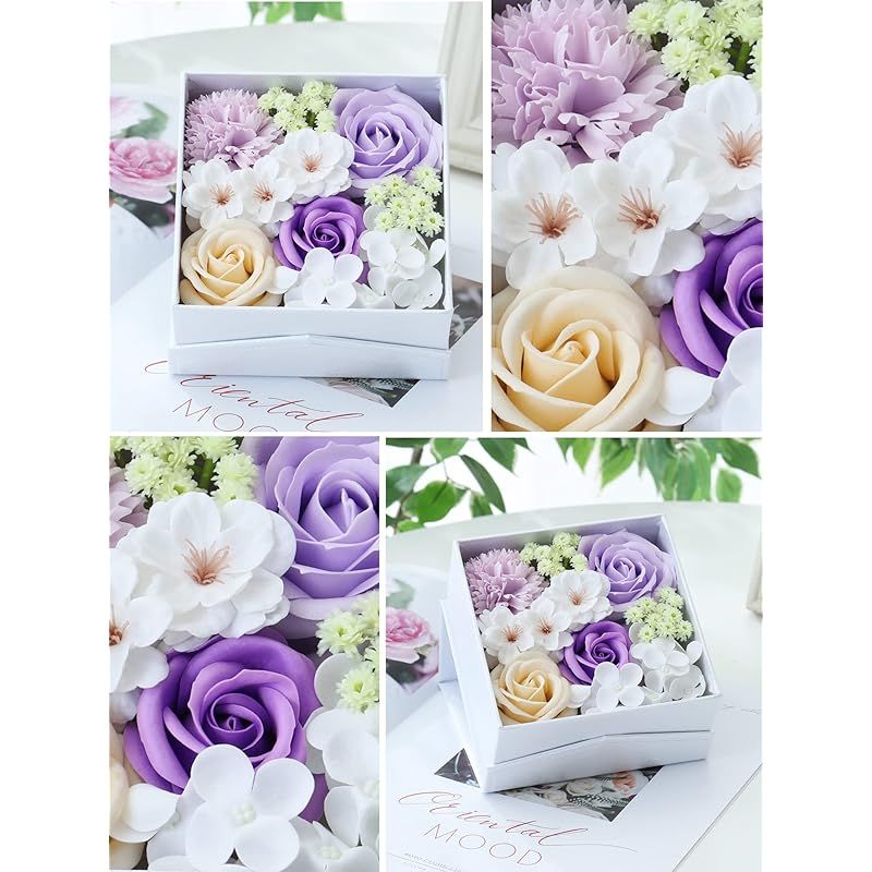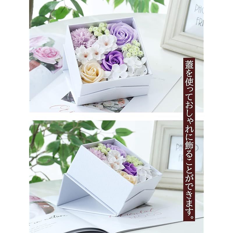 【新品】 WEISHY 母の日のプレゼント ソープフラワー 造花 フラワーボックス ホワイトデー お返し ギフト 誕生日プレゼント 女性 結婚祝い 卒業祝い 枯れない花 還暦祝い 退職祝い 古希祝い 敬老の日 インテリア (四角形・パープル・白フレーム)