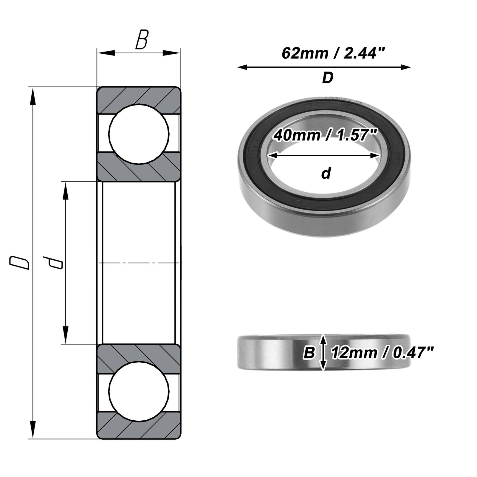 仕様: 外径: 62mm / 2.44、内径: 40mm / 1.57、幅: 12mm / 0.47、タイプ: 6908DDU、精度レベル: P5、基本荷重評価 (kN): Cr:13.7 C0r:10、限界速度(min-1): 6300