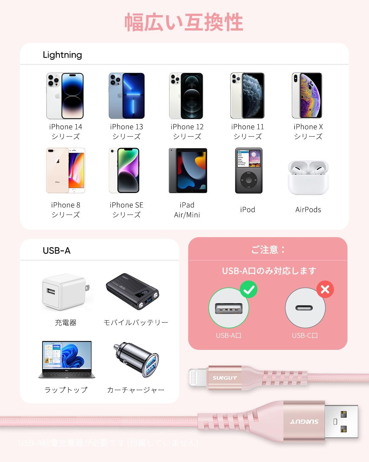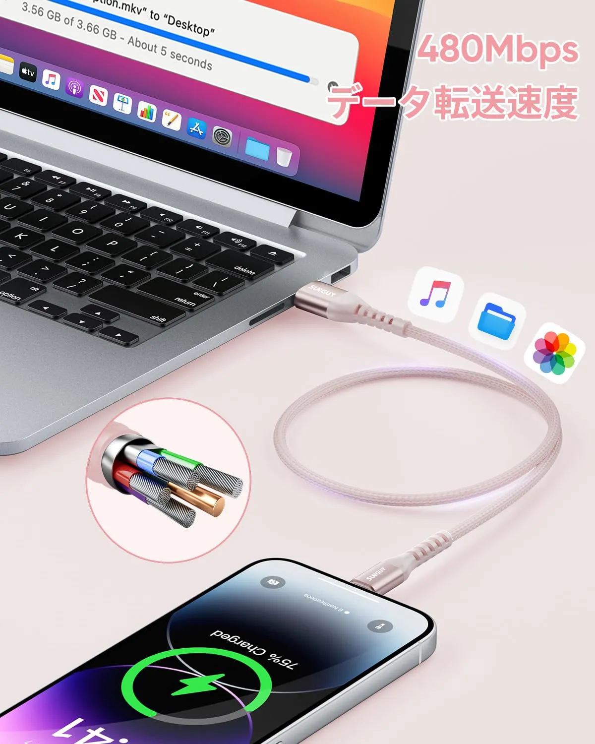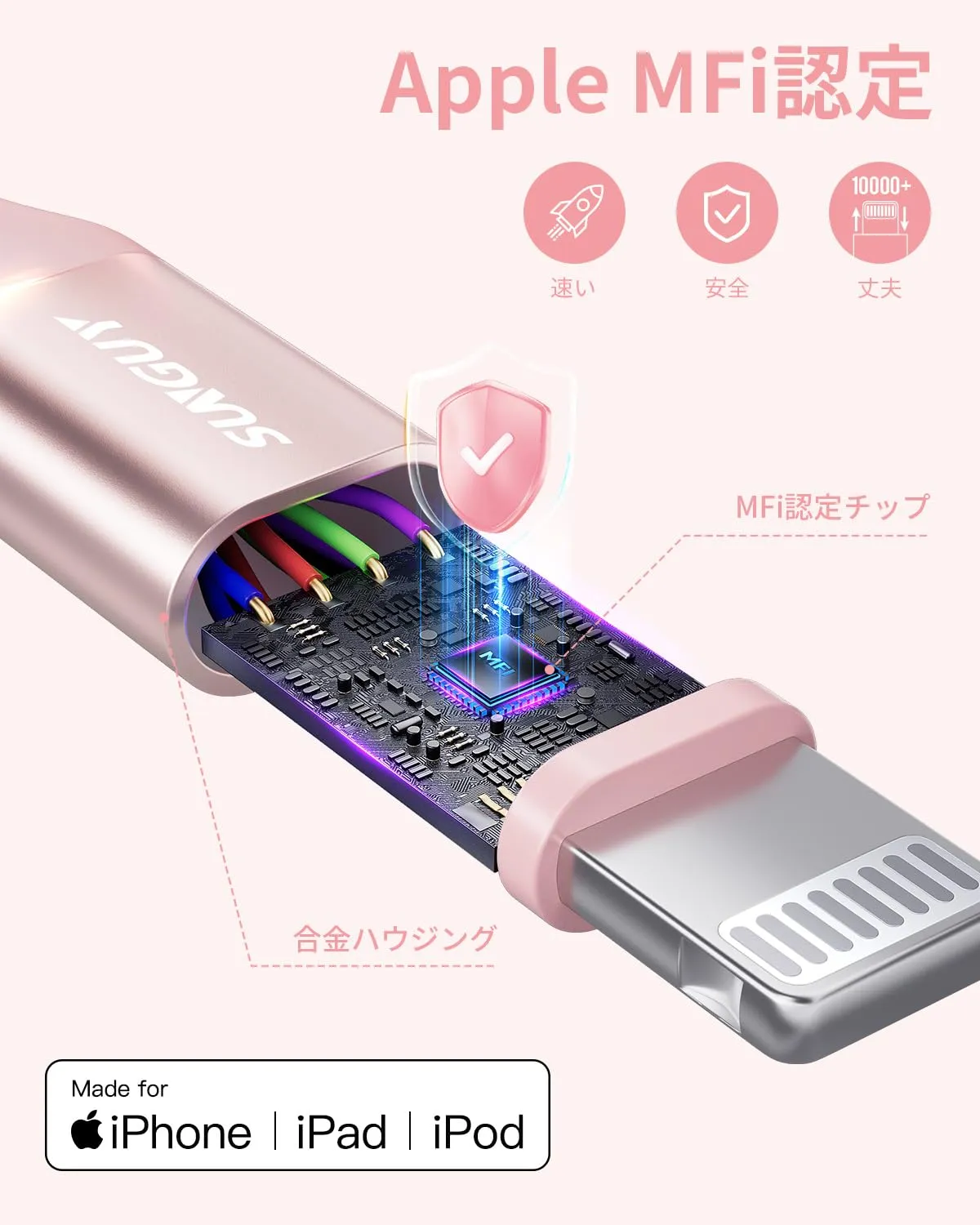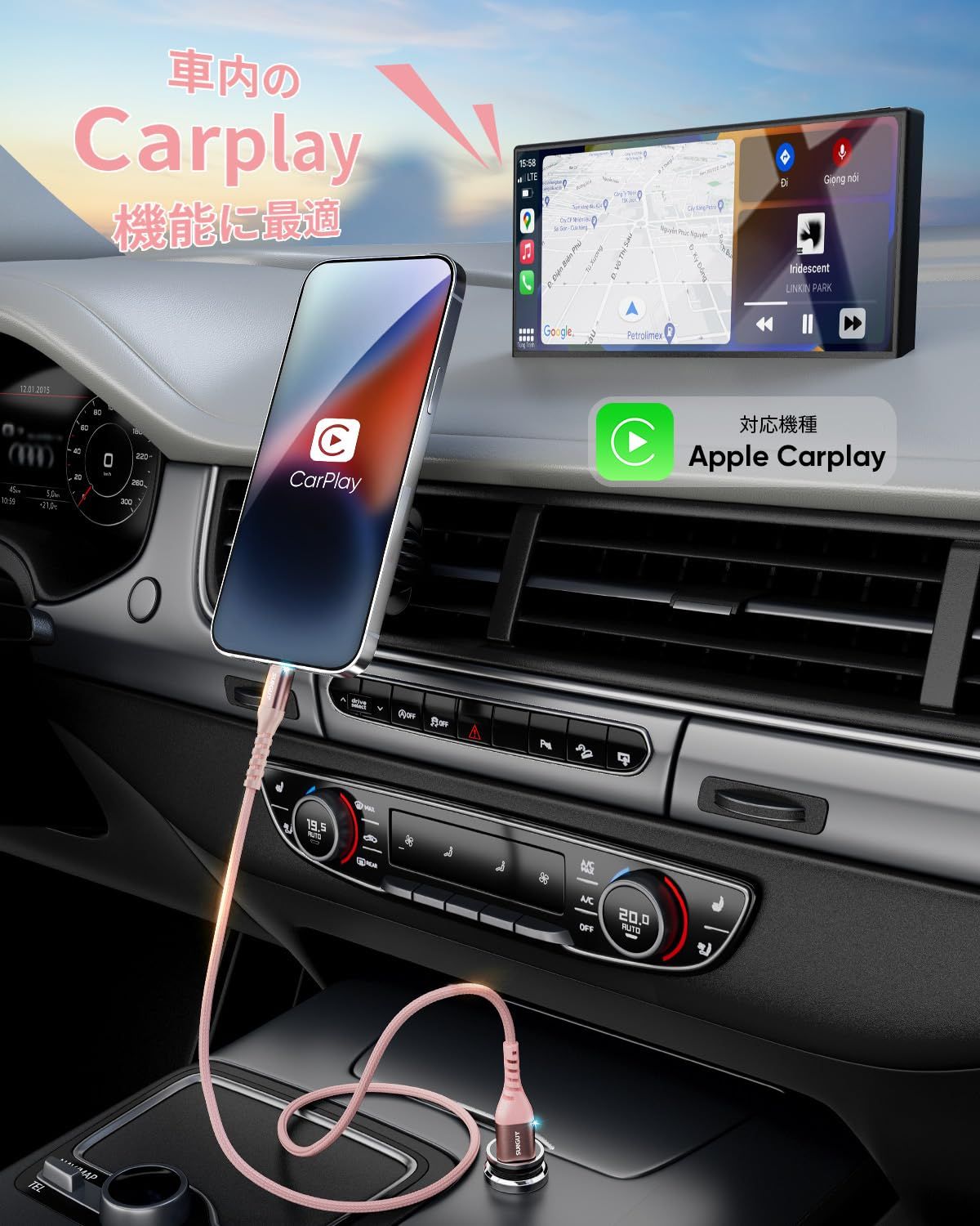 【充電・データ転送同期/Carplay対応】このiPhone充電ケーブルは最大12Wに急速充電可能です。スマホの充電と同時に、このusb lightning ケーブルは最大480Mbpsの高速率で数秒間に写真、音楽、ビデオなどをパソコンに転送できます。さらに、このiPhoneケーブルで車内でCarplay機能を使うことができ、外出がより便利になります。