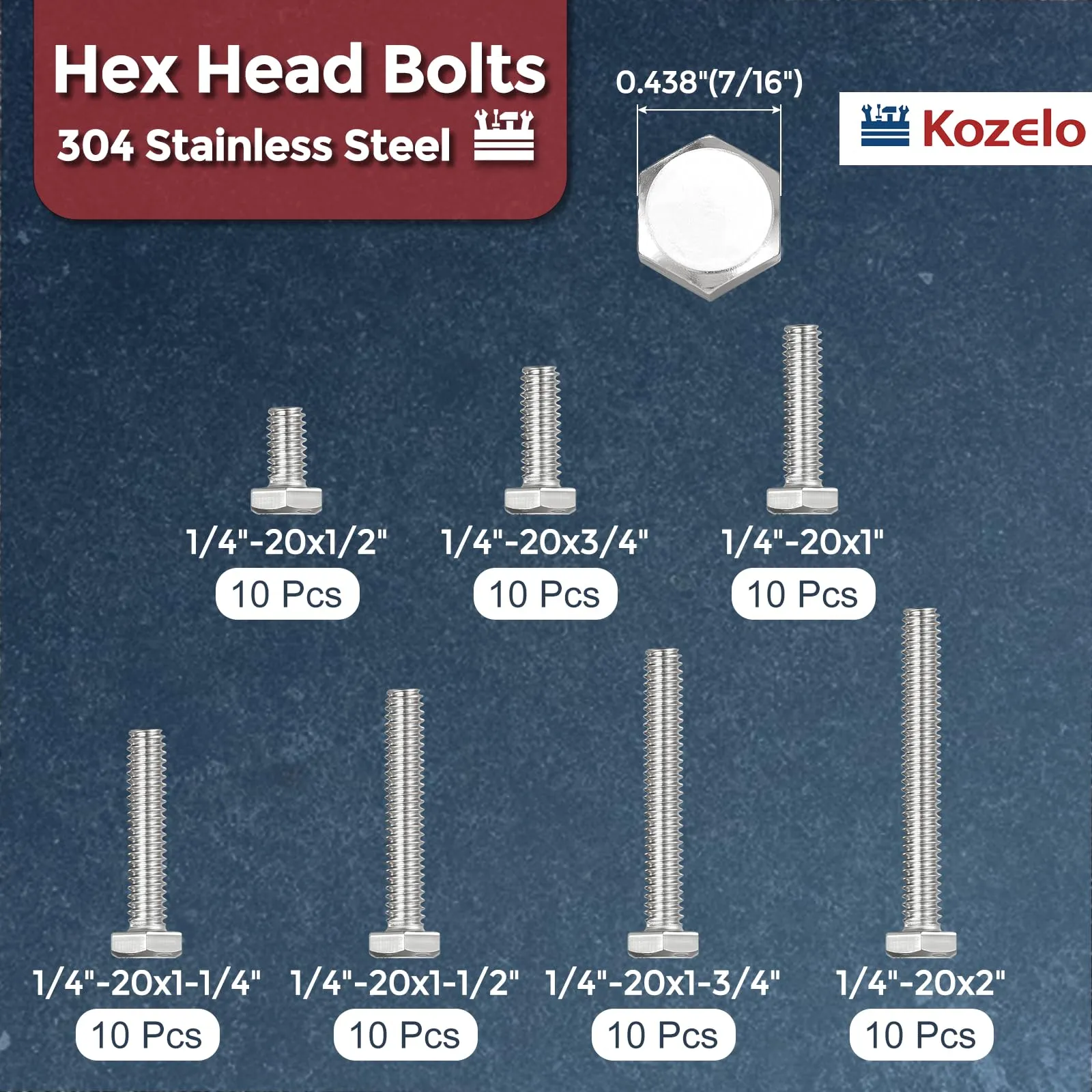 1- パッケージ内容 - 70個入りの六角ヘッドボルト、ねじ:全ねじ、ヘッドスタイル:六角ヘッド、ねじサイズ:1/4-20、ねじ長さ:1/2インチ、3/4インチ、1インチ、1-1/4インチ、1-1/2インチ、1-3/4インチ、2インチ、素材:304ステンレス鋼、性能グレード:A2-70