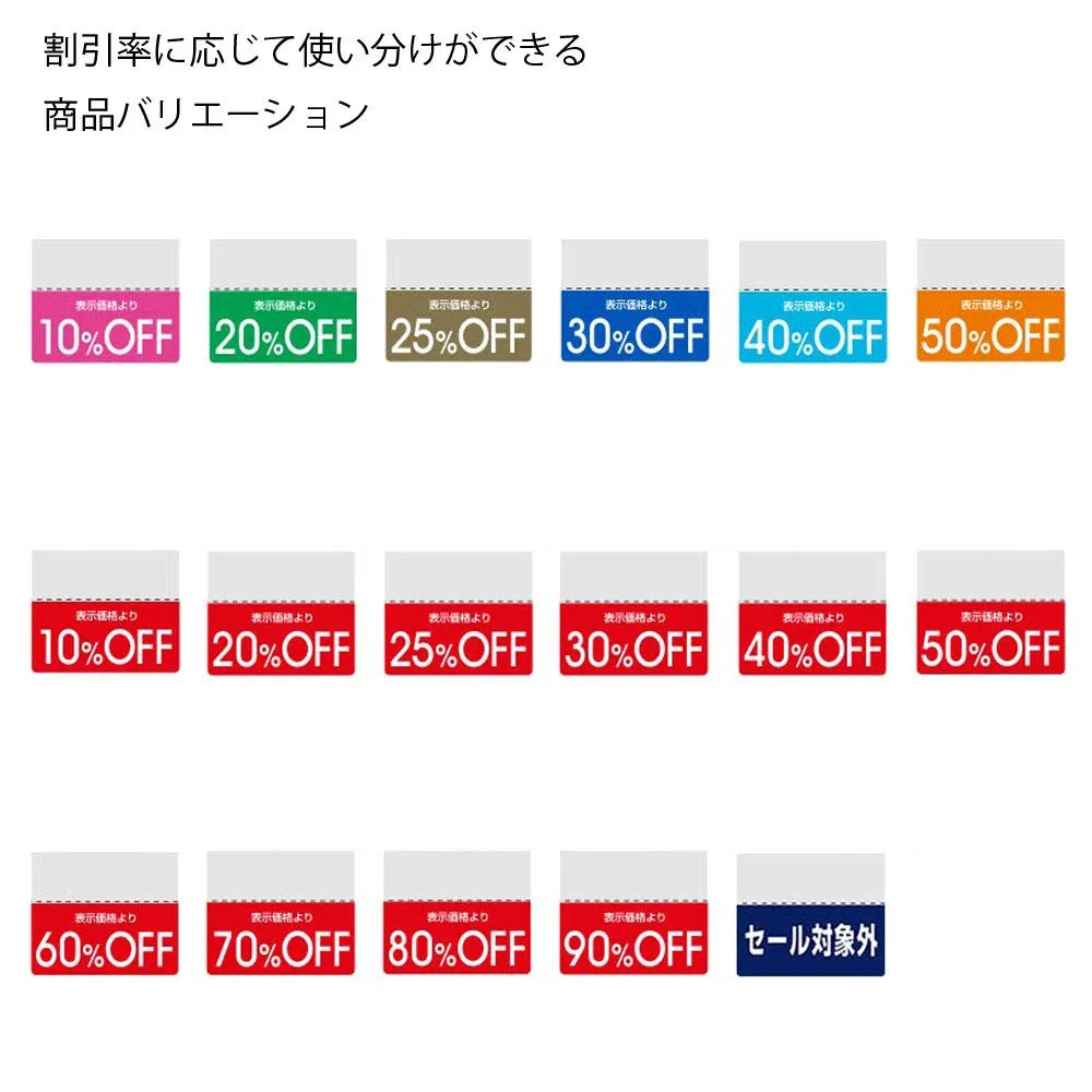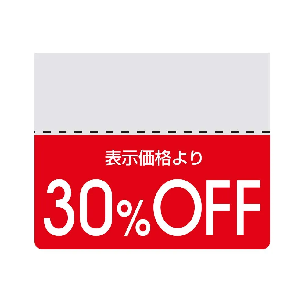【商品の提札に付けて使える割引用シールです。】 シモジマの、提札の裏に貼りつけて使用する割引シール、タックラベルです。 便利な半のりタイプですので、タグの裏面下部にタックシールを貼りつけることで、値引きの表示が覗くように使用出来ます。 スダンダードな色付きで、お買い得商品のアピールに最適です。 のり部分と値引き表示の間にミシン目が付いており、セール終了時や割引率の変更時に切り離すだけで表示の変更が完了するのがうれしいポイント。 セールやバーゲンなどのイベントや、店舗での普段使いにも便利です。 一度に大量に必要な時も、お店の備品補充にも嬉しいお得な大容量一袋200片入。 シール柄:30%OFF(スタンダードカラー) 入数:200片入り 商品名: 提札の裏に貼りつけて使用する割引シール、タックラベル 便利な半のりタイプ。タグの下からラベルが覗くように貼り付けられます。 大容量一袋200片入り。