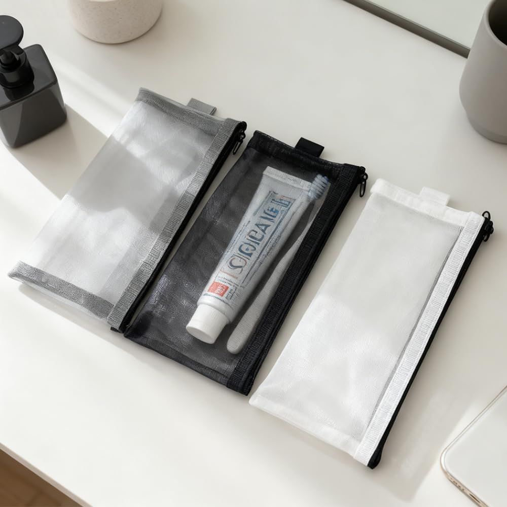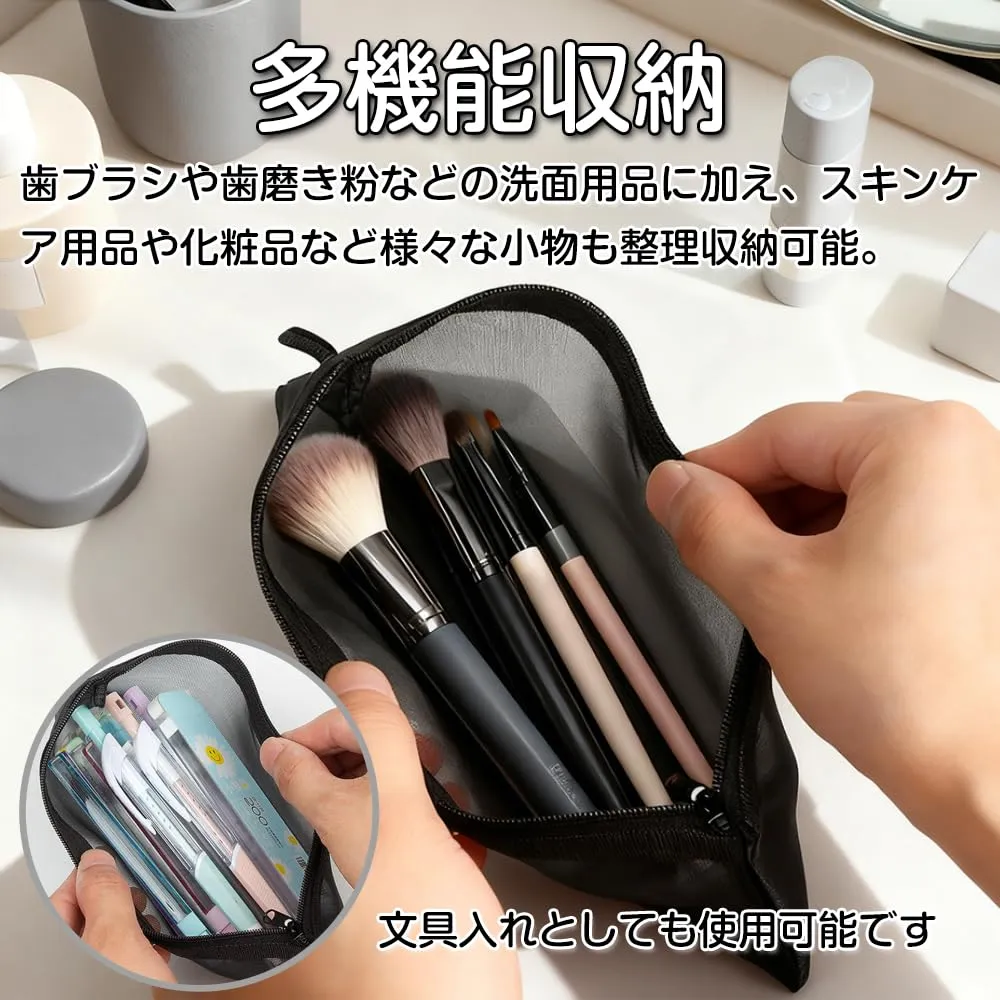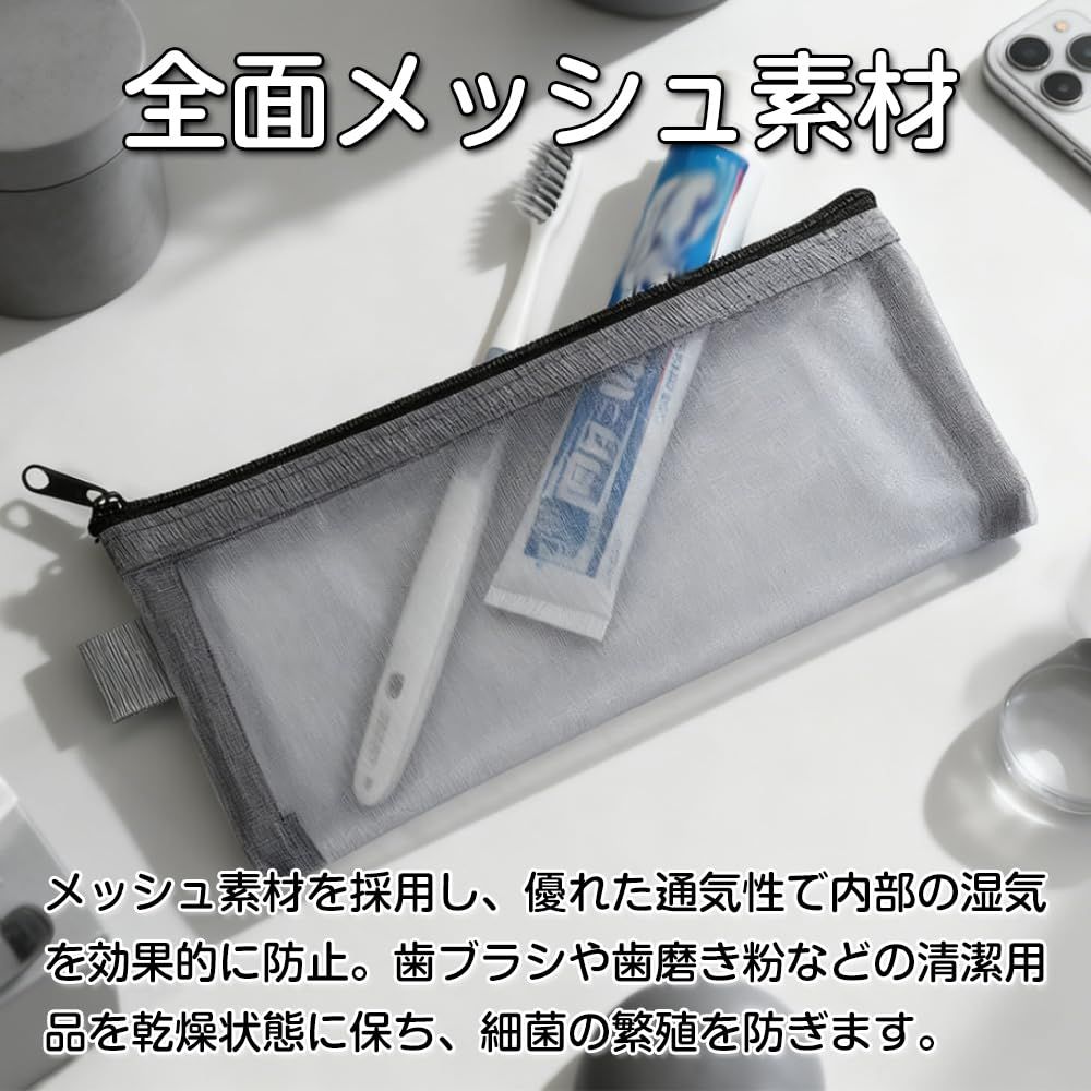 【素材】耐久性に優れたナイロンメッシュ生地を採用し、通気性が抜群。使用後の歯ブラシが湿気をこもりにくく、歯ブラシや歯磨き粉などの衛生的な乾燥状態を保ち、細菌の繁殖を抑制します。