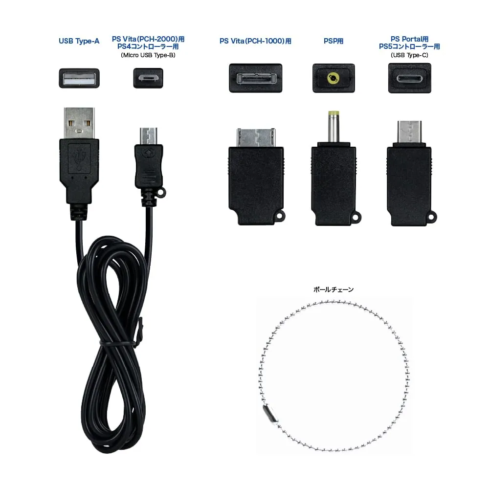 ◆紛失防止用のチェーン付き! microUSBケーブルと各アタッチメントは、無くさないようボールチェーンで繋がっています。 型番:ANS-H144 JAN:4573201421142 懐かしいゲーム機の充電に! Type-Cも追加して現行機も充電可能となりました! PS5Portalやスマホにも! 紛失防止のチェーン付き!