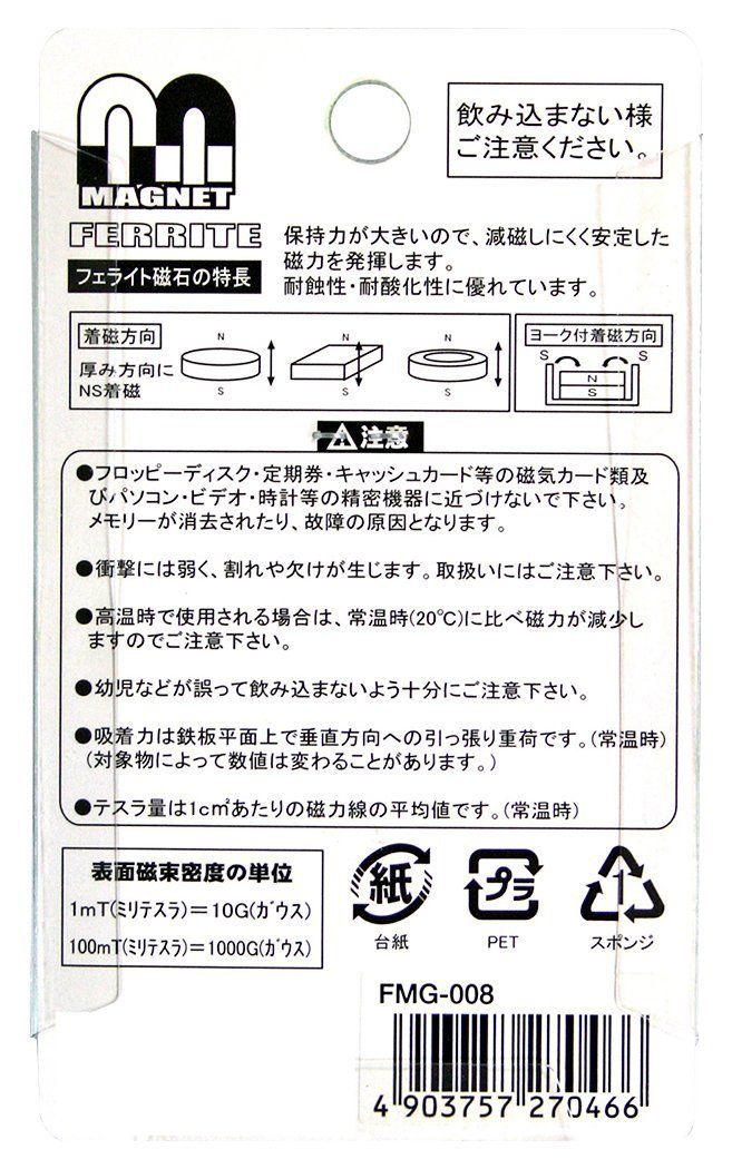 【フェライト磁石の特長】 保持力が大きいので、減磁しにくく安定した磁力を発揮します。 耐蝕性・耐酸化性に優れています。 種類:異方性フェライト 表面結束密度:120mT(ミリテスラ) 磁力の強さ:中 吸着力:3.2kg 製造国:日本
