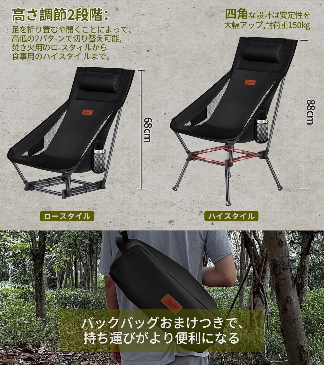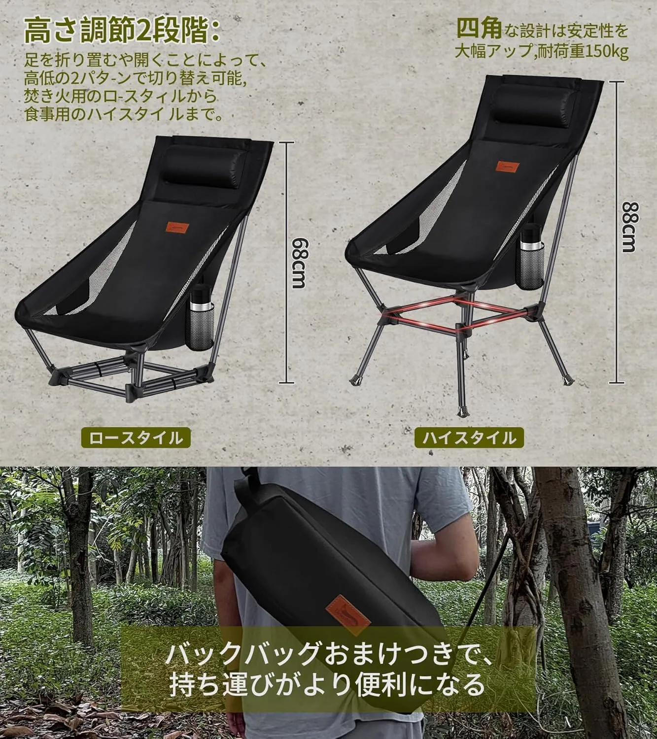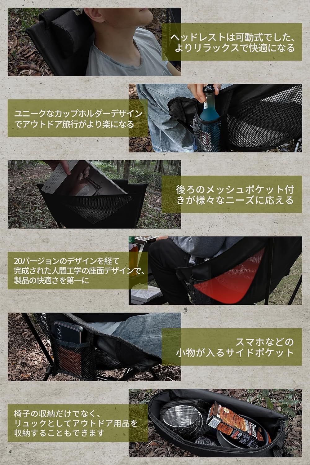 【優れる耐久性と通気性】 アウトドア椅子は800Dポリエステルを採用した座面とメッシュの設計で、あつい季節も蒸し暑くなく、抜群の通気性と快適な座り心地を確保できます。座面の裏も防水加工し、雨でもタオルでちょっと拭くだけ座れます。さらに、座面を深くするし、ハンモックのように体にフィットし、ゆったりと包み込まれる座り心地を実現したレジャーチェアです。