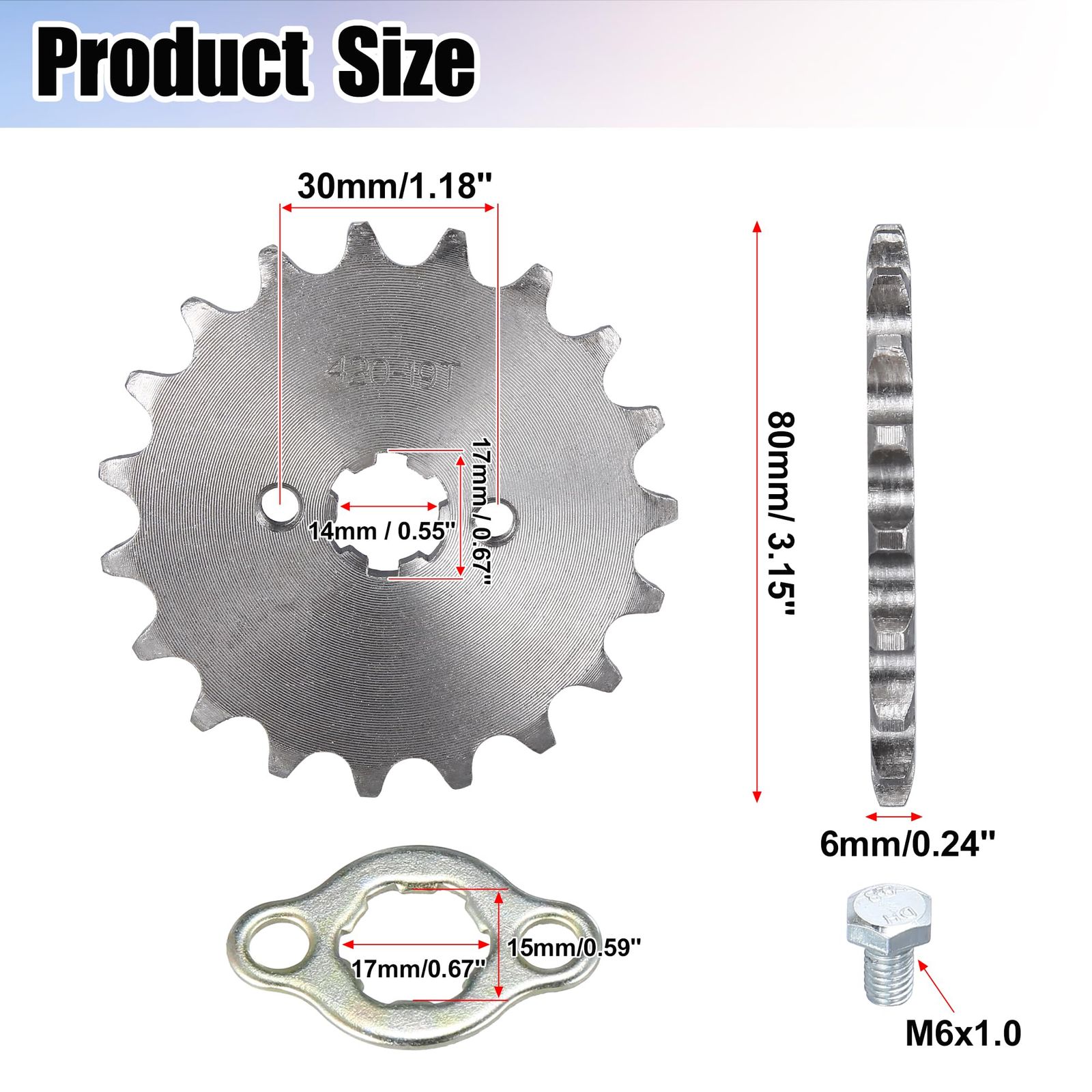 サイズ:フロントスプロケット420チェーン19歯17 mm。アイ-アイセンターの長さ:30 mm, 取り付け穴の直径:17 mm, ギアの内径:14 mm。