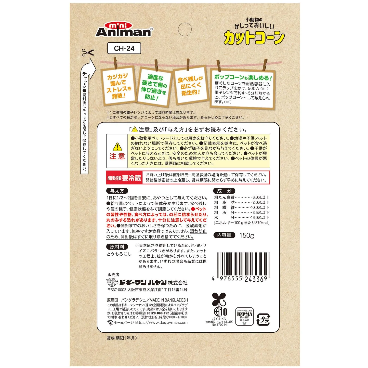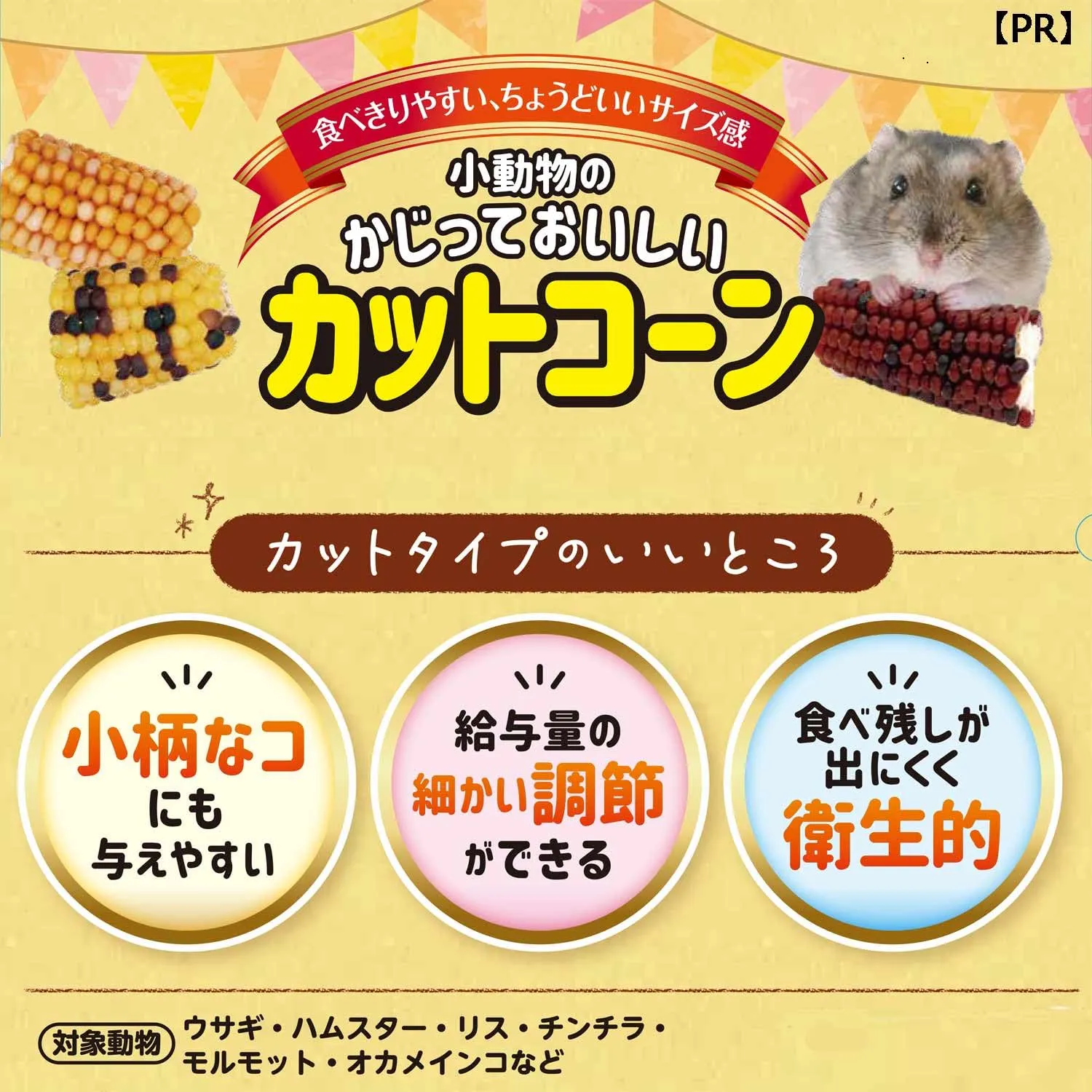 バングラデシュ産とうもろこしを食べやすい大きさにカットした、自然なおいしさの小動物用おやつです。