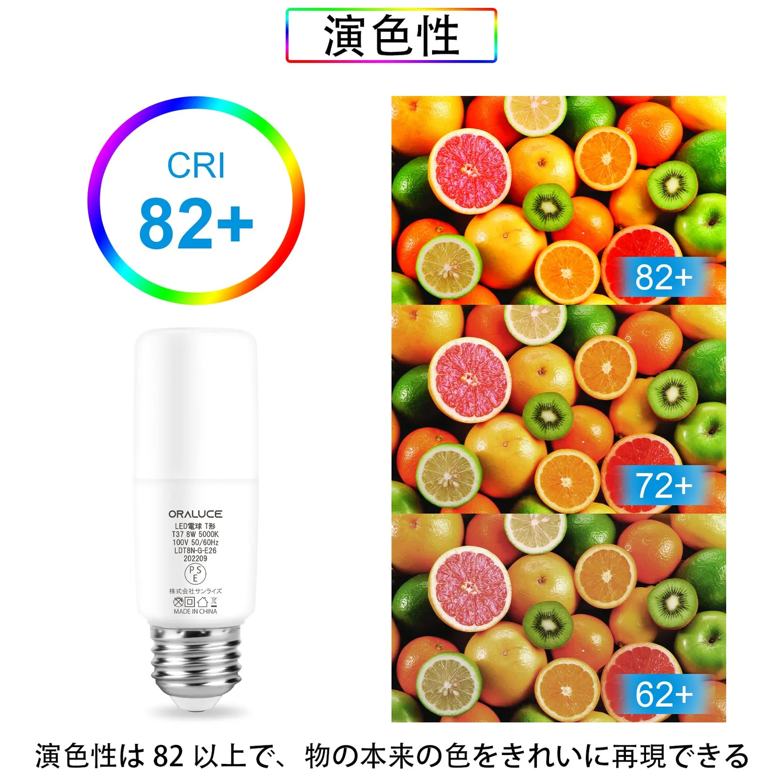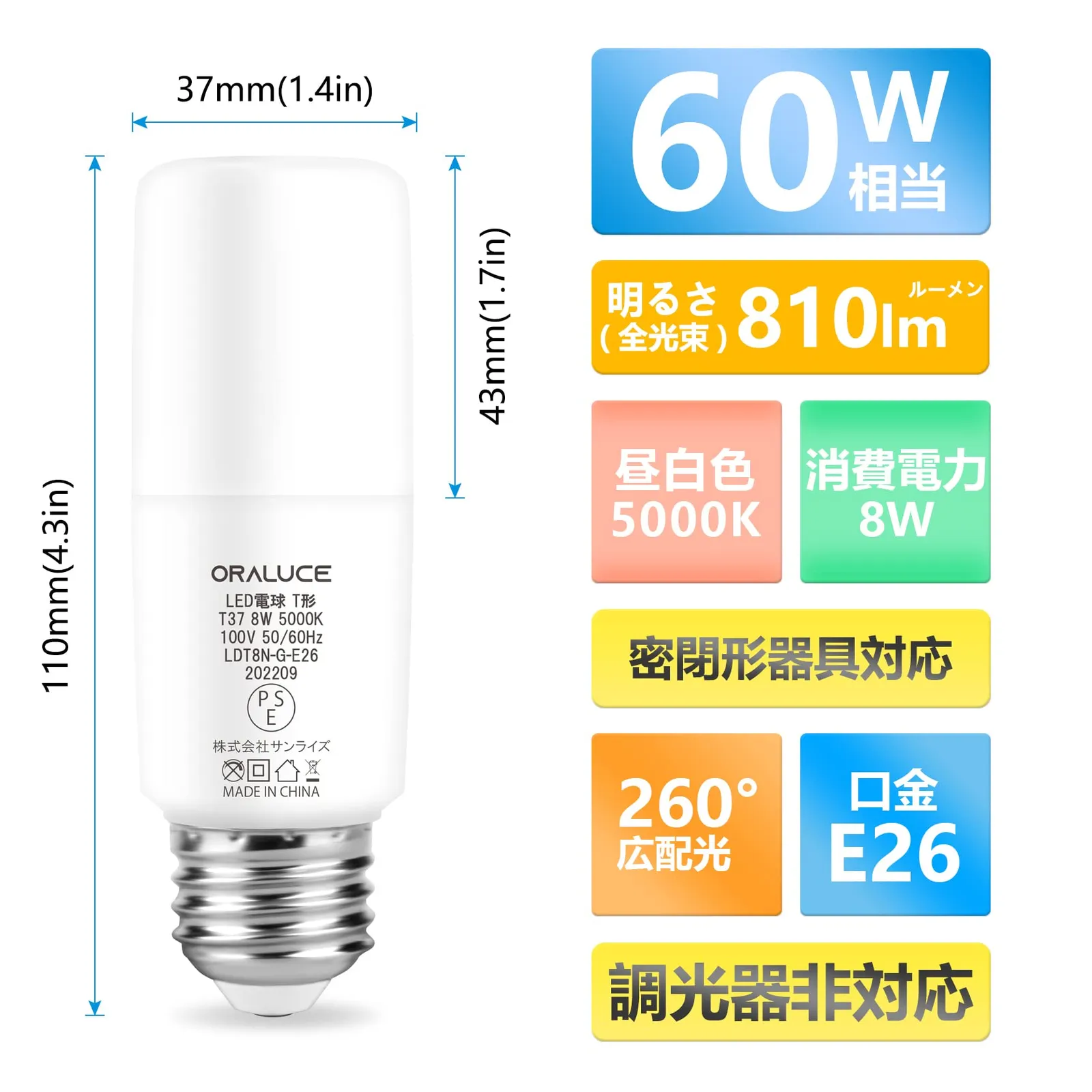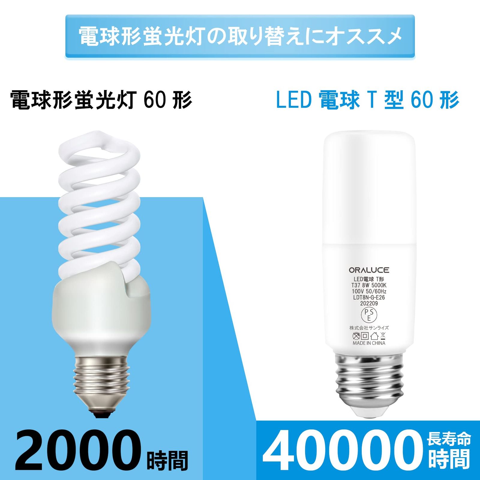 新品 ORALUCE LED電球 T形タイプ E26口金 60W形相当 昼白色 5000k 8W 810LM 全方向タイプ 調光不可 断熱材施工器具対応 電球形蛍光灯EFD15 EFD25代替推奨 6個入