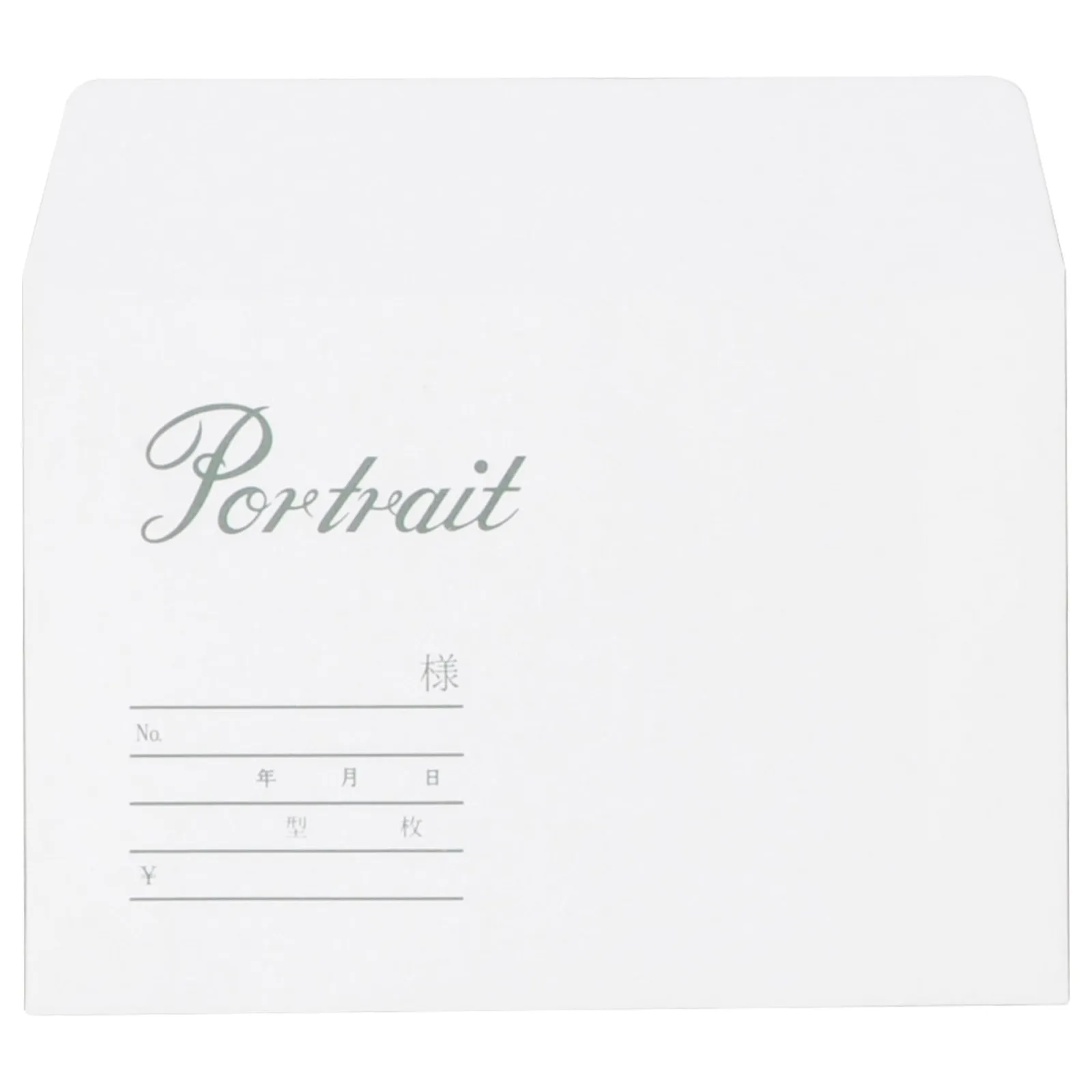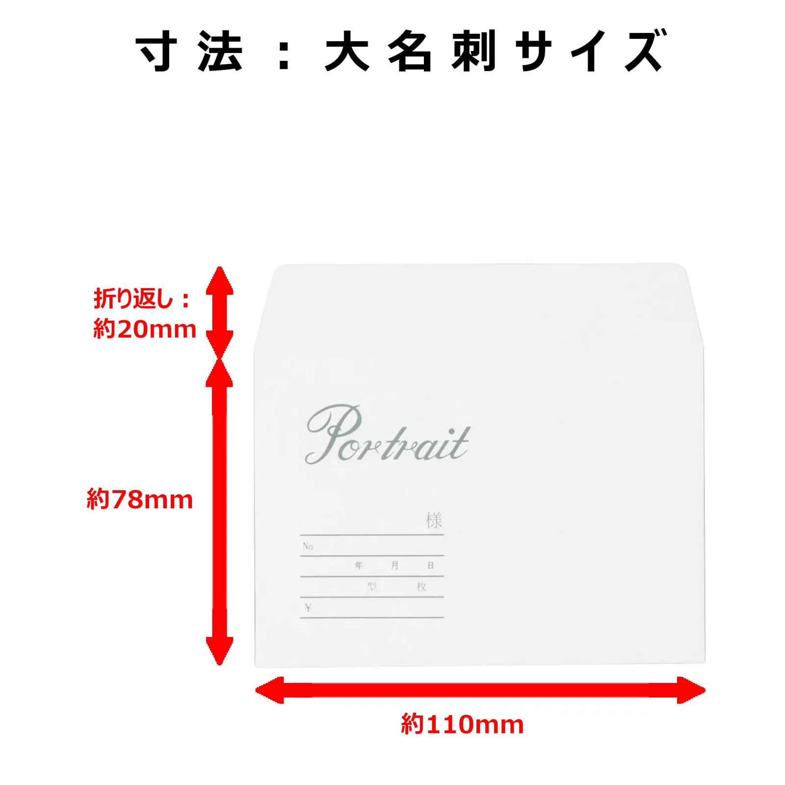 ■材質 : 紙 お祝いや記念の写真をプレゼントするときに写真を保護する紙製のスリーブ。証明写真などに適した大名刺サイズ 表紙カットには白地にグレーの文字で”Portrait”と印刷されています。 100枚入りで業務用や学校行事等、御写真を入れて渡すのにも適しています。 「お名前」、「NO.」、「日付」、「枚数」、「金額」を記入できるメモ欄付き。