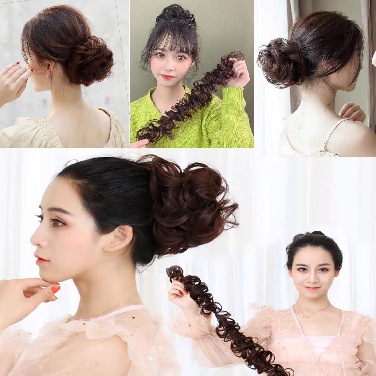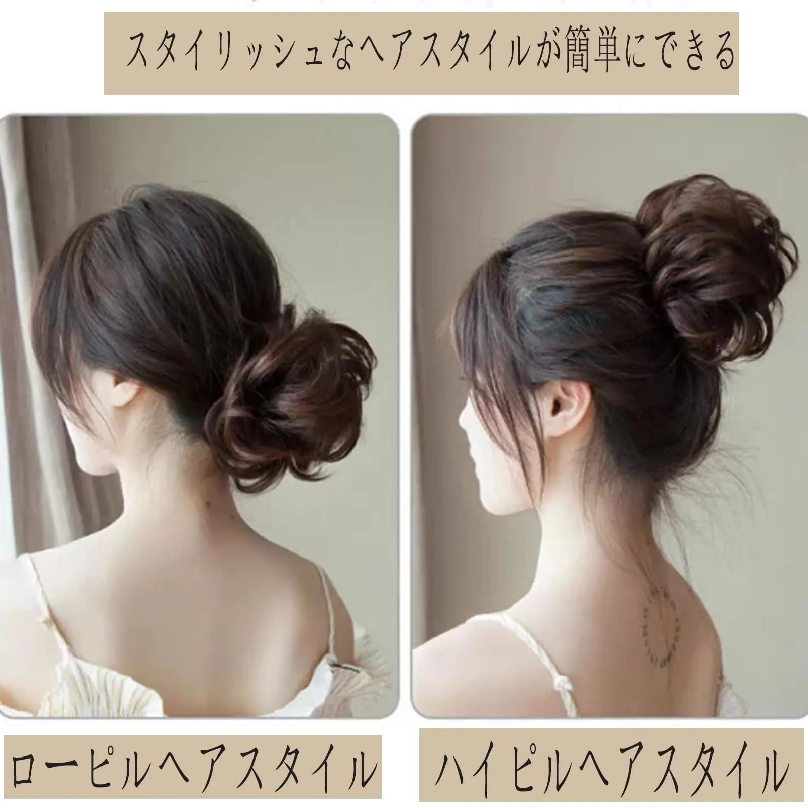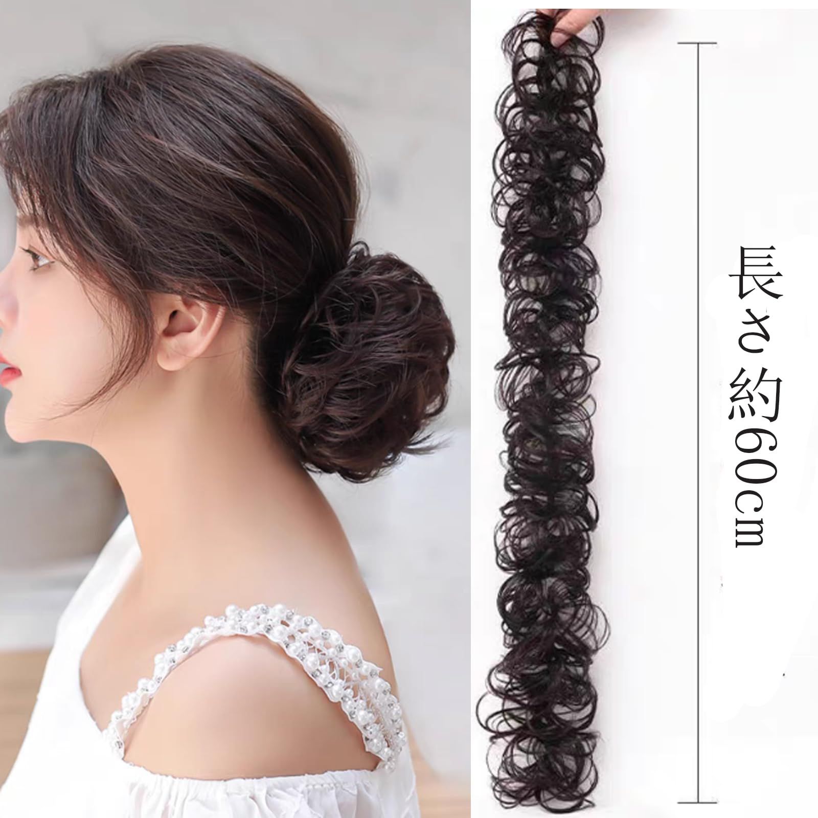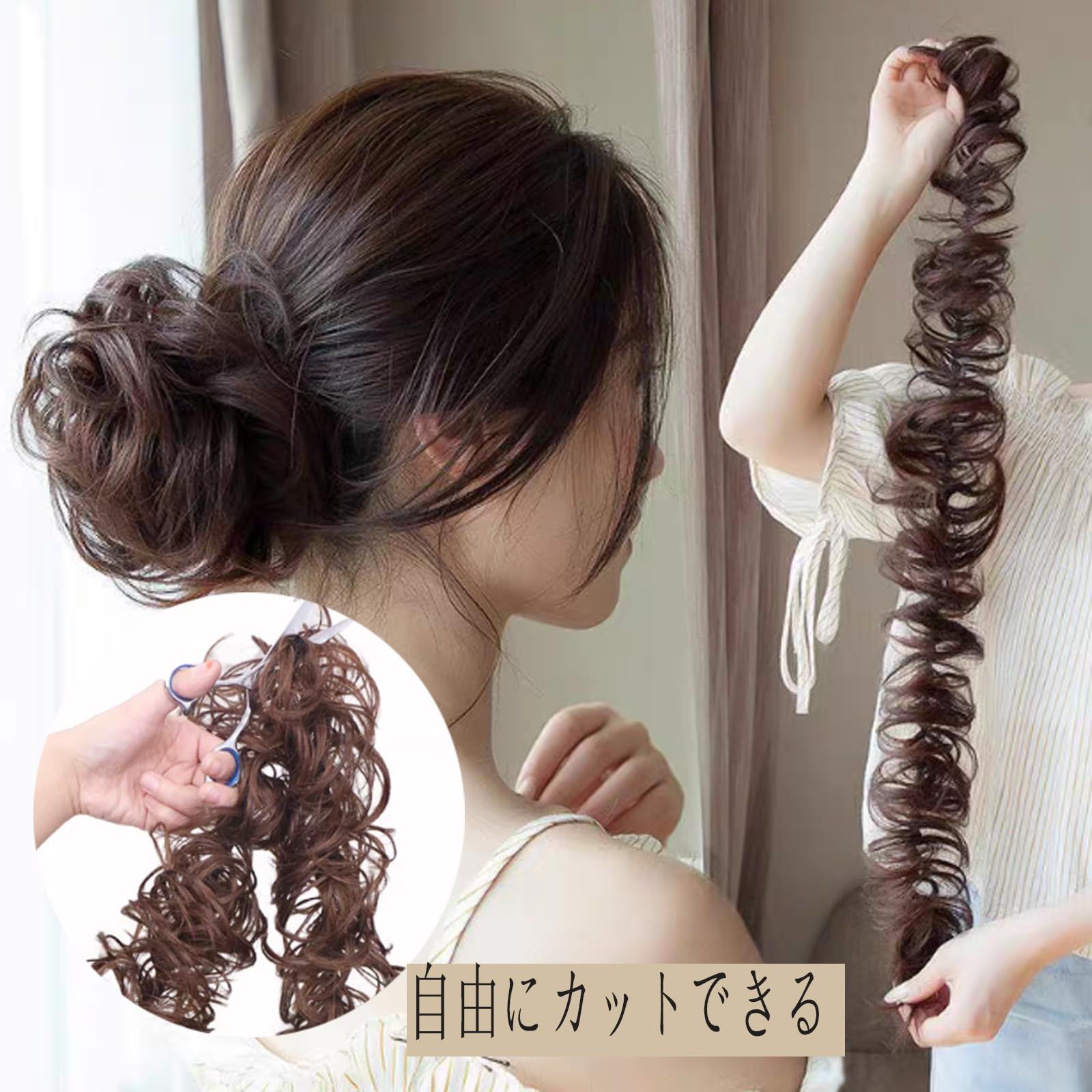 「髪を傷めない」お団子ウィッグは少しカールがあります。パーマいらずで実現できる美しさ、自分の髪にダメージを与えません。こだわりぬいた配合で自然な髪質、まるで地毛のような自然なカラー。