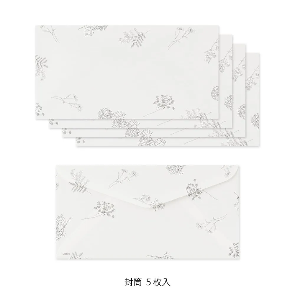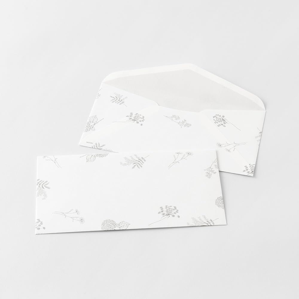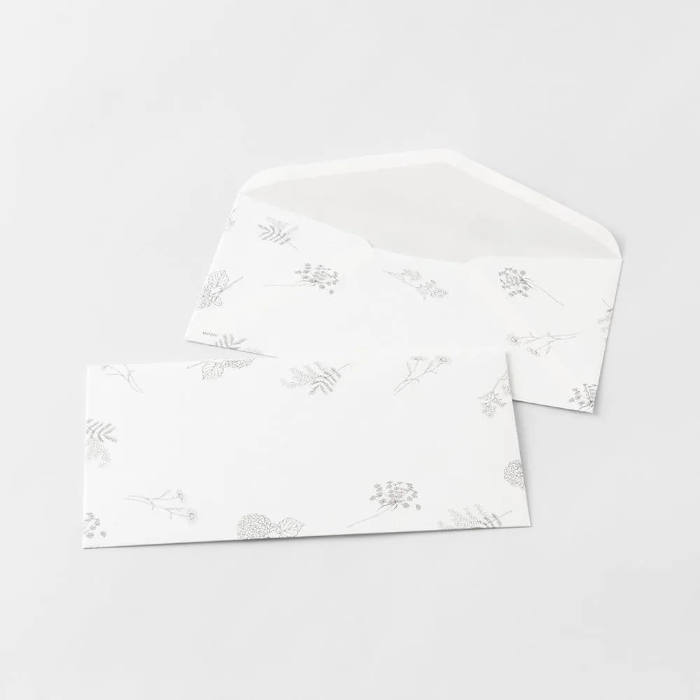 アイボリーの封筒には、繊細なお花の散らし柄を施しており、内側は書いた内容が透けにくいよう、薄いグレーの印刷を加えています。