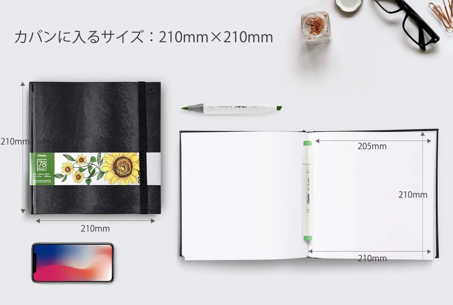 新品 スケッチブック 210mm×210mm 200gsm Ohuhu 画用紙 78枚 ミシン目付 アルコールマーカー用 スケッチ/イラスト/落書き/メモ/ノート PUレザー ブラック