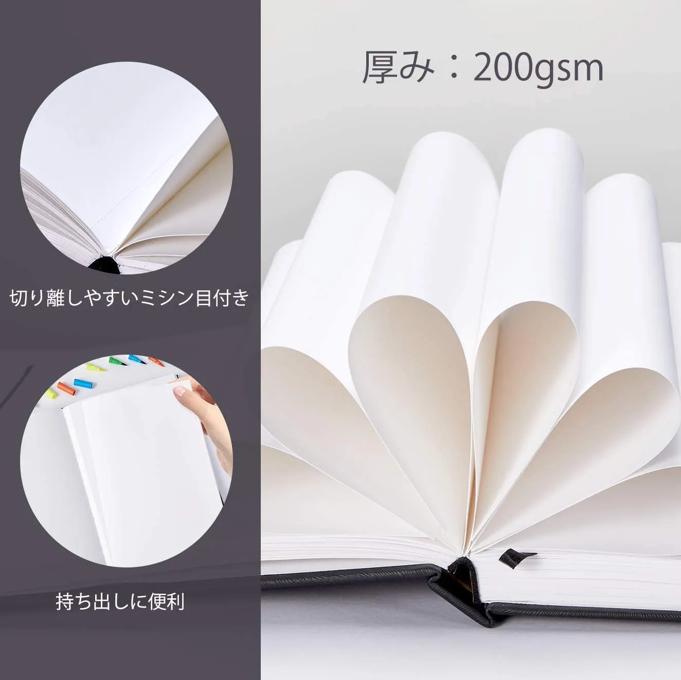 【丈夫・厚紙】:200gsm(0.25mm)超厚口。表面が凹凸がなくツルツルしている画用紙なので、スケッチ、マンガ、製図、デザインを描かれる方におすすめ!インクの乗りも良くてグラデーションやかすれの効果などを活かすことができますし、快適な使い心地を実感していただけます。