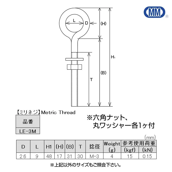 新品 MM 水本機械製作所 SUS304 ステンレス ロングアイボルト(ミリネジ) LE-3M