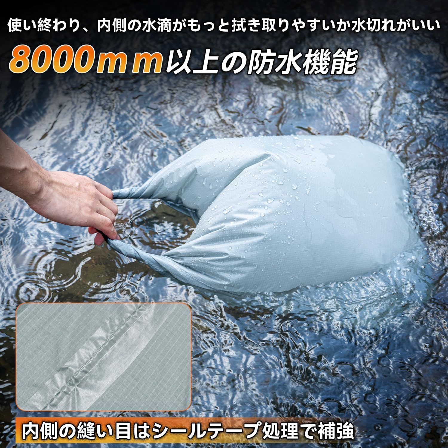 8000mm以上の超高耐水圧:??このドライバッグで激しい雨の際でも中の物が濡れない内側の縫い目はシールテープ処理で補強、使い終わり、内側の水滴がもっと拭き取りやすい、水切れがいい。