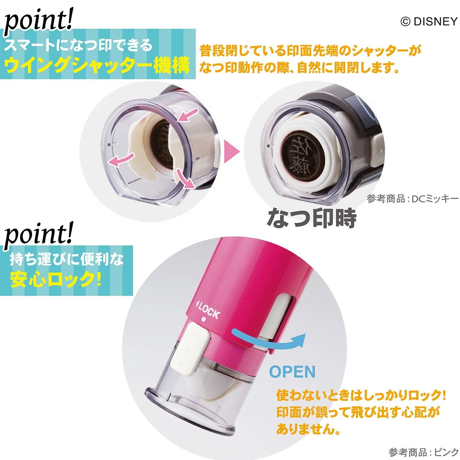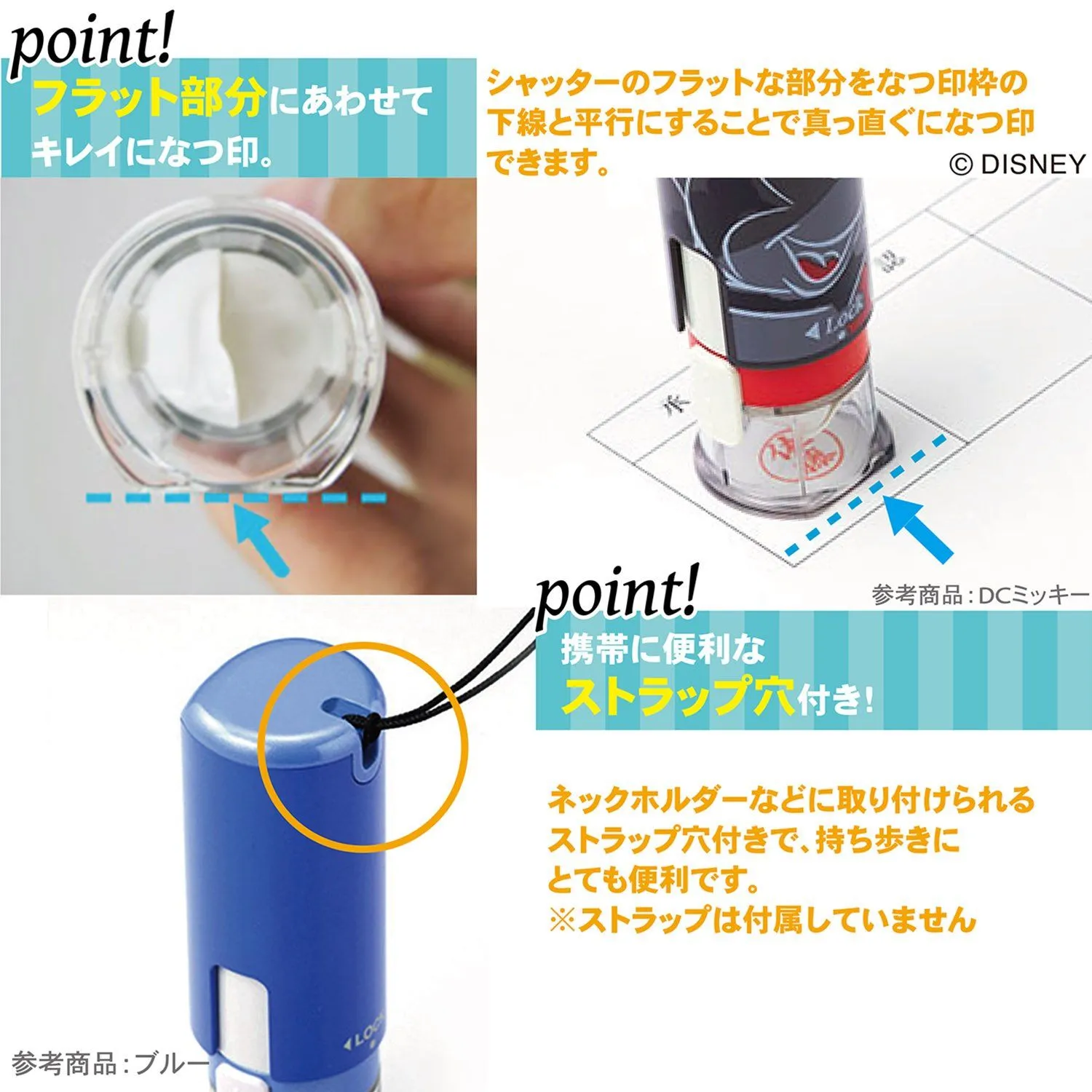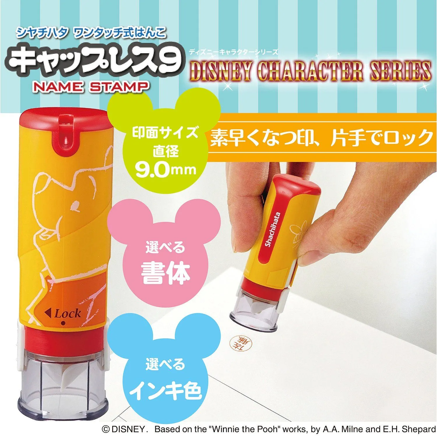 【特長】キャップレスタイプ・ストラップホール付き かわいい「ディズニーキャラクター」デザインのネーム印。 素早くなつ印、片手でかんたんロックができる。キャップがいらないシャチハタ印! 印面サイズは9mm。 スマートになつ印できるウイングシャッター機構を採用。普段閉じている印面先端のシャッターがなつ印動作の際、自然に開閉します。 シャッターのフラットな部分をなつ印枠の下線と平行にすることで真っ直ぐになつ印できます。 使う時以外はしっかりロックできるので、印面が誤って飛び出す心配がありません。 携帯に便利なストラップ穴付きです。 最後までご確認頂き誠にありがとうございました。 上記をご確認頂き、ご購入いただけましたら幸いです。 何かご不明な点がございましたらお気軽にメッセージからお問い合わせ下さい。