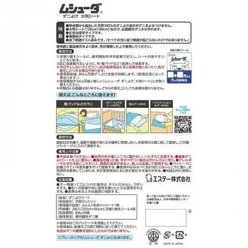 【使用方法】 ※お取り替えシールに、使用開始年月を鉛筆で記入し、シートの見やすいところに貼る。 ※ふとん・ベッドの場合は敷ふとんや敷パッドなどの下に敷く。 または、使用場所のサイズに合わせてカットし、直接肌に触れないように使う。 ※天日干ししないでください。光が長時間当たると効果が弱くなったり、色が変化する場合があります。 ※使用開始後、約6ヵ月間ダニよけ効果が持続します。(使用状況によって異なります) ※使用開始から6ヵ月後に新しい「ムシューダ ダニよけ 大判シート」とお取り替えください。