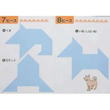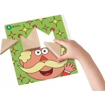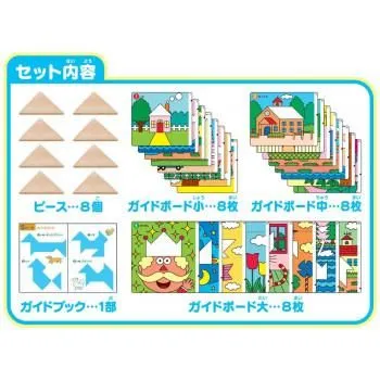 ピースの形がすべて同じ二等辺三角形なので、幼児でも簡単に図形に親しむことができます。ガイドボードは、1ピースをはめることからはじめ、少しずつピースの多い形にチャレンジしていける構成になっています。試行錯誤をくり返し、夢中で遊んでいるうちに難しいパズルもできるようになり、自然に図形感覚や考える力がついてきます。