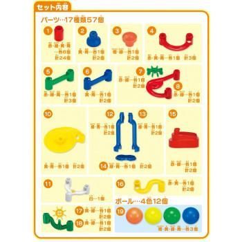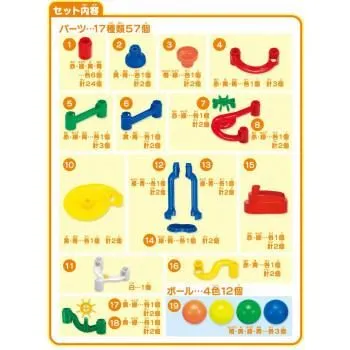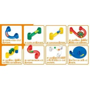 いろいろなパーツを使って、ボールが転がるコースを考えるおもちゃです。最初は少ない部品で小さなコース、慣れてきたらだんだん複雑なコースを作りましょう。組みたてて、転がしてみて、組みかえて…試行錯誤のくり返しが創造力と考える力を養います。