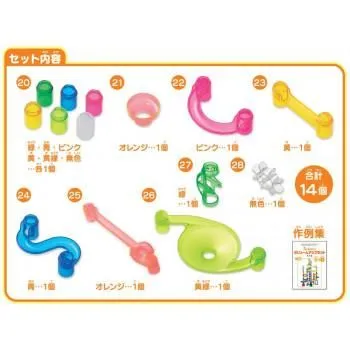 「NEWくみくみスロープ」(別売り)と組み合わせると、さらにバージョンアップしたコースが組み立てられます。ボリュームアップセットのパーツはすべてスケルトンタイプ!