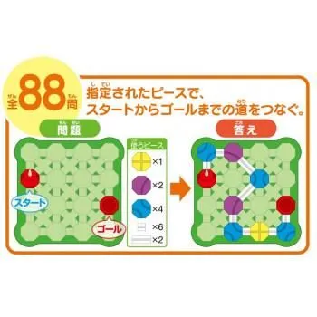 ロジカルロードメーカーは、スタートからゴールまでの道をつなぐパズルです。使えるピースの数や種類、ゴールまでのピースがはまる方向や距離といった情報を基に、ピースの置き方を論理的に考えてパズルを解きます。楽しく遊びながら論理的思考力やプログラミング的思考を養います。