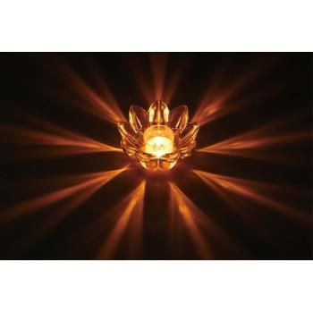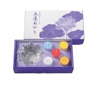 ローソクは新仏旗になぞらえた五色で構成しております。蓮の形をしたグラスホルダーは、エレガントで洗練されたデザインで、ローソクの光を美しく映し出します。