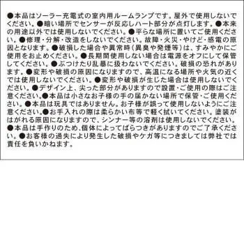 ■ラッピング(包装)対応不可です。 暗くなるとセンサーが反応して、ハート部分が点灯します。 ※商品は手作りのため、形状やプリントに多少のバラつきがあります。ご了承ください。 ※初期不良のみ返品交換の対応となります。商品到着から一週間以内(初期不良対応期間)に必ず販売店にご連絡下さい。尚、ご連絡のない場合は初期不良の交換対応を致しかねますのでご注意ください。 (完売商品の場合などは返品での対応とさせて頂きます) サイズ(約)W6.1×L6.7×H11.1cm 個装サイズ:10.5×8.5×15.5cm 重量個装重量:230g 素材・材質レジン 生産国中国 fk094igrjs かわいいソーラールームランプ。 商品番号:ab-1884971 ※代引き不可 同梱不可※北海道、沖縄、離島送料は別途お見積り。※手配完了後は、ご注文キャンセルを承る事が出来ません。何かございましたら事前にお問い合わせ下さい。