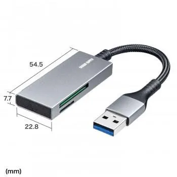 超スリムなアルミ筐体のカードリーダーです。断線に強いメッシュケーブルタイプです。高級感のあるアルミボディです。スーパースピードモード(5Gbps/規格値)に対応しています。コンパクトで持ち運びに便利なサイズです。