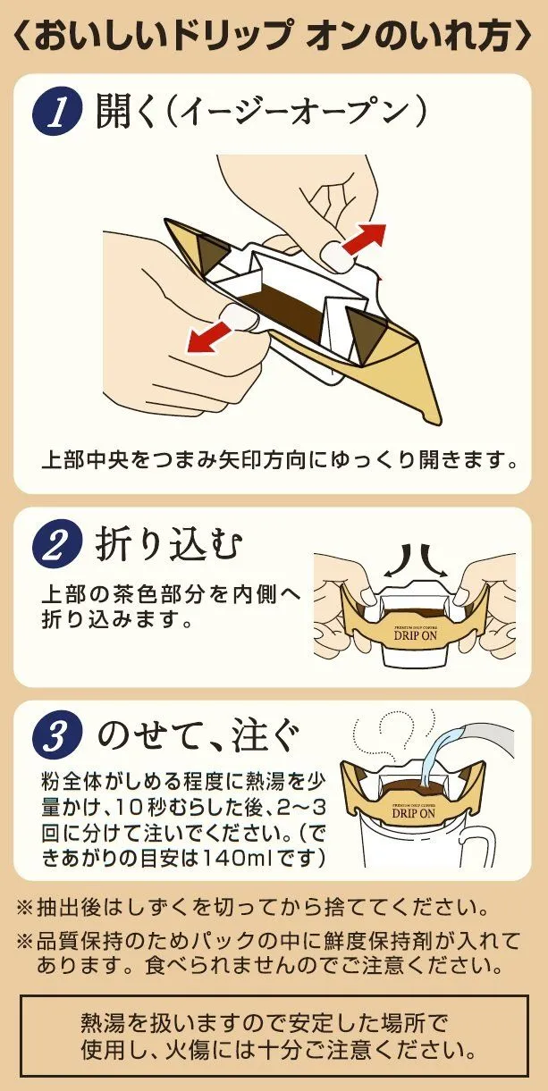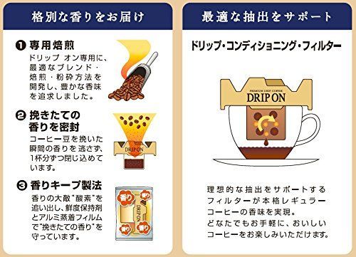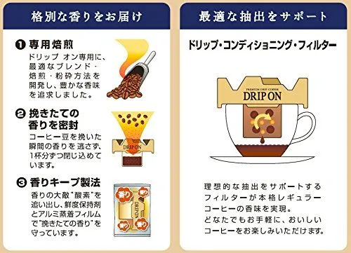 【商品特徴】カップに乗せてお湯を注ぐだけで、本格レギュラーコーヒーの味をお楽しみいただけます。 格別な香味が楽しめるプレミアムドリップコーヒー ~ドリップオン~ 苦みと酸味のバランスがよく、豊かなコクとすっきりした口当りのブレンドコーヒーです。 世界が認めた味と香りをお楽しみください。 ※抽出後はしずくを切ってから捨ててください。 ※鮮度保持のためバックの中に鮮度保持剤が入れてあります。食べられませんのでご注意ください。 ご注意(免責)>必ずお読みください 使用上の注意:内袋開封後は、お早目にご賞味ください。熱湯を扱いますので安定した場所で使用し、火傷には十分ご注意ください。 最後までご確認頂き誠にありがとうございました。 上記をご確認頂き、ご購入いただけましたら幸いです。 何かご不明な点がございましたらお気軽にメッセージからお問い合わせ下さい。