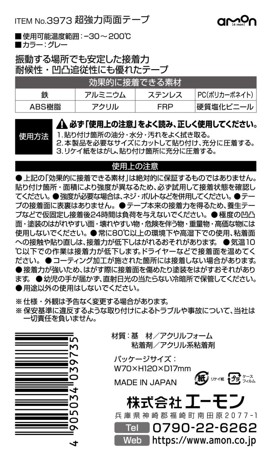 ■振動する場所でも安定した接着力、耐候性・凹凸追従性にも優れたテープ ※製品の仕様は予告なく変更する場合がございます。 ※ご購入の前にホームページをご確認ください。 2024年4月1日より、社名が「エーモン工業株式会社」から「株式会社エーモン」へ変更となりました。 それに伴いまして、パッケージ・取扱い説明書等が随時変更となります。 お手元に届くタイミングにより社名表示が混在する可能性がございますので予めご了承ください。 最後までご確認頂き誠にありがとうございました。 上記をご確認頂き、ご購入いただけましたら幸いです。 何かご不明な点がございましたらお気軽にメッセージからお問い合わせ下さい。