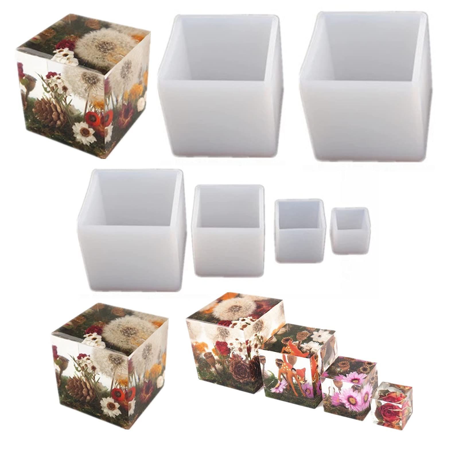 材質:シリコン 出来上がりサイズ:20mm、25mm、35mm、40mm、50mm、65mm 6サイズのキューブが作れる立方体のシリコンモールドのセットです。鏡面仕上げでツルツルの綺麗な作品が作れます。レジン、エポキシ樹脂など素材にお使いいただけます。 半透明なので、中を確認しながら作業することができます。シリコン型は柔軟性がありデザインがシンプルなので、完成品を型から外しやすい。ドライフラワー、ラメ、ビーズなどを入れて、自分だけの作品がお作りいただけます。 パッケージ:正方形のシリコン型6個
