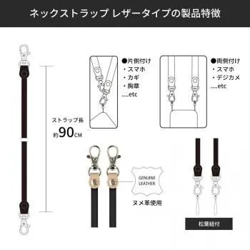 レザー素材を使用したネックストラップです。両端がカニカン仕様になっており、目的に合わせた用途でご使用いただけます。付属の松葉紐もしくは、別売りの「マルチリングプラス」と組み合わせることでスマートフォンを首から下げることも可能です。