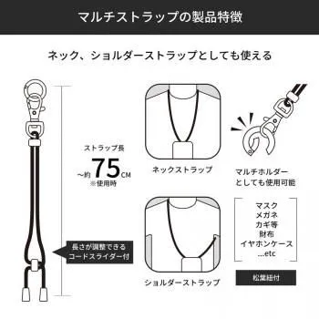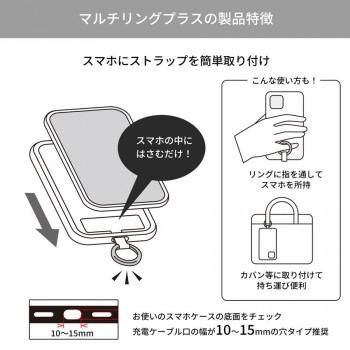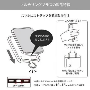 リングに指を通すことでスマートフォンの持ちやすさを向上し、落下を防止します。リング部分を持ち手にして持ち歩いたり、カバン・ベルトループ等に取り付けたりと様々な用途でご使用いただけます。付属のショルダーストラップと組み合わせることで、スマホショルダーとして使用可能です。