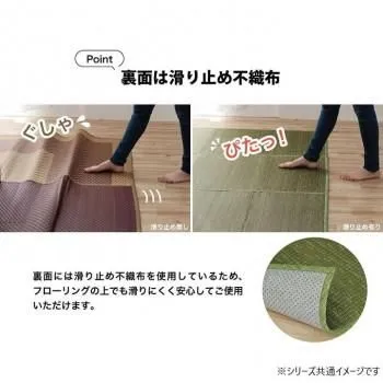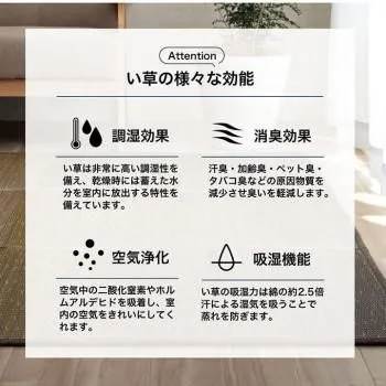 制菌・抗菌防臭があります。裏は滑り止め不織布付きで、滑る心配がありません。い草には空気の自然浄化作用、湿度の調節作用、消臭効果などがあります。