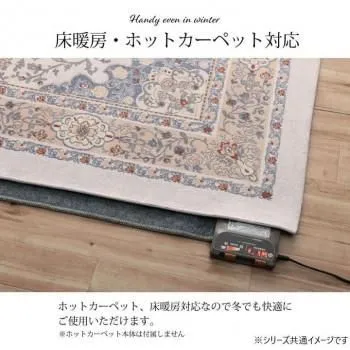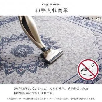 シェニール織りは、18世紀末に英国で生まれ、ドイツで人気が出た両面パイルの織物です。上品な風合いのジャカード織りで、ペルシャ絨毯のようなメダリオン柄を表現。デザイン性が高く、耐久性にも優れています。さらっとした肌触りで、季節を問わず一年中お使いいただけます。裏面にはフローリングを傷つけにくい不織布張り。ホットカーペット、床暖房対応。毛足が短いためお掃除もカンタン。