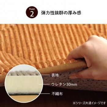 ■8万回の耐久試験にクリアした、耐久性抜群の極厚タイプ 中材にウレタン30mmを使用したボリュームタイプ。8万回の耐久試験にクリアした、へたりにくいラグです。 クッション性と弾力性があるので、フローリングで寝転んだり、テレビ鑑賞したり、本を読んだりとフローリングでくつろぎたい方におすすめです。