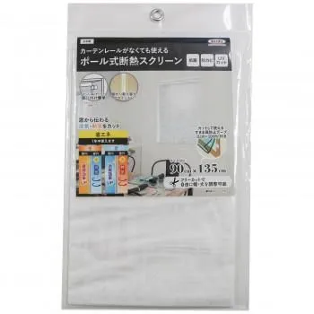 市販のテンションポールやのれん棒を使ってカーテンレールがない場所でも取り付けられる断熱スクリーンです。室内への熱気・冷気の侵入を抑え、冷暖房効率をアップします。お部屋の間仕切りとしてもおススメです。