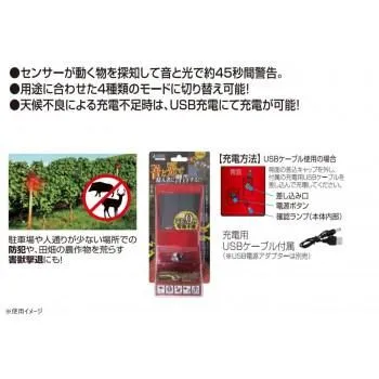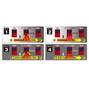 ソーラー充電式で電気代もかからず、怪しい侵入者に音と光で警告する警告灯です。用途に合わせた4種類のモードに切り替えてお使いいただけます。