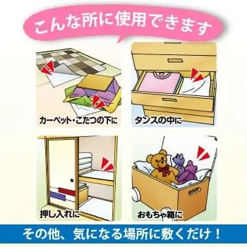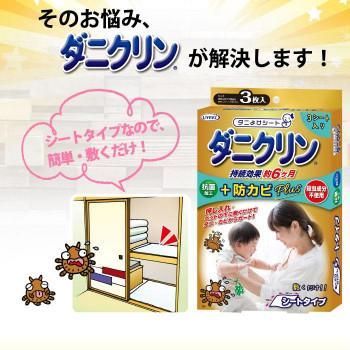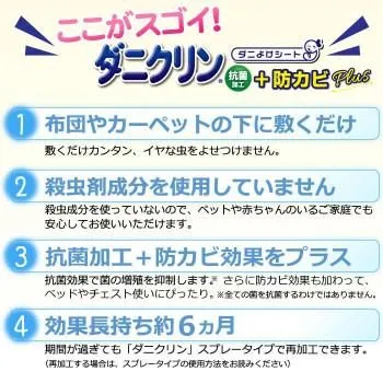 【商品の特長】 1.布団やカーペットの下に敷くだけでイヤな虫をよせつけにくい。 2.抗菌効果にさらに防カビ効果も加わって、より使いやすくなりました。 3.殺虫剤成分を使用していないので、布団などに接触する場所にもご使用できます。 4.お取り替えの目安は約6ヶ月。期限が過ぎても、別売りの「ダニクリン」スプレータイプで再加工できます。 5.当社のダニクリン商品との併用は、より一層効果があります。