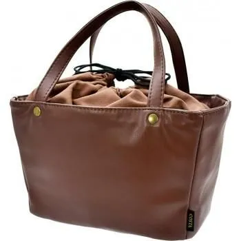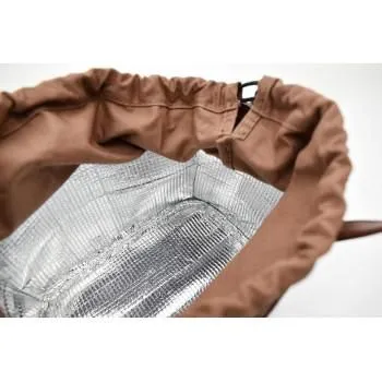 高級感のあるフェイクレザー素材で、バッグのようにオシャレにランチを持ち運ぶことができます。巾着カバー付きで、中身が見えたり飛び出るのを防ぎます。内側はアルミ蒸着フィルムで、保冷・保温効果を援助します。