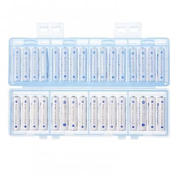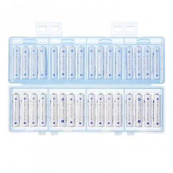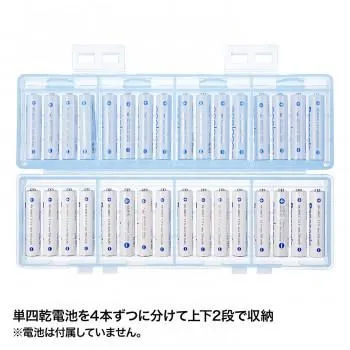 単四乾電池の収納に対応した、32本収納可能な2段式大容量電池ケースです。電池は4本ずつに分けて収納できるので管理に便利です。充電式電池、未使用乾電池の整理や保管に最適な大容量タイプです。スタッキングしたときにケースがずれにくい設計です。