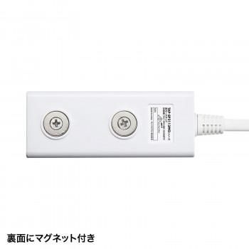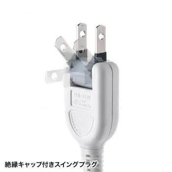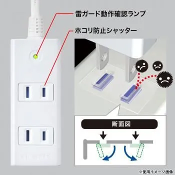 雷ガードを内蔵しており、接続機器を雷から守ります。雷ガード作動中は確認ランプが点灯します。トラッキング火災予防に極めて有効な絶縁キャップ付きのスイングプラグを採用しています。スチール机に仮固定できる便利なマグネット付きです。ホコリの侵入を防ぐ、防止シャッターが付いているので安全です。