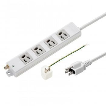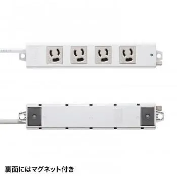 3P抜け止めの4個口仕様電源タップです。裏面にマグネットが付いていますので、スチールのデスクなどに仮固定することができます。アース端子付きです。