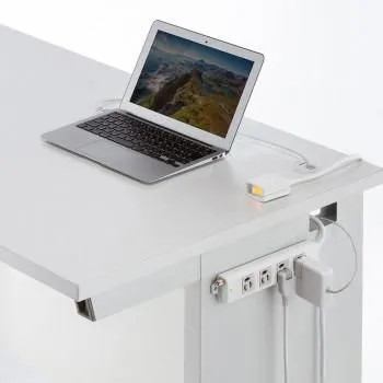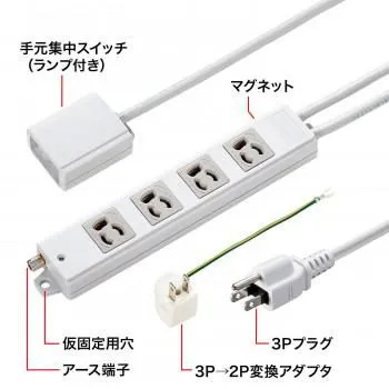P抜け止めの4個口仕様電源タップです。接続した機器の電源を手元でまとめてON・OFFできる、ランプ内蔵手元スイッチ付きです。裏面にマグネットが付いていますので、スチールのデスクなどに仮固定することができます。アース端子が付いています。