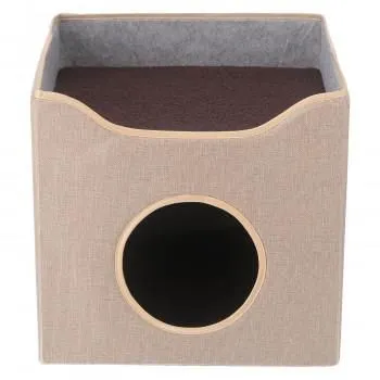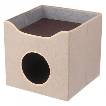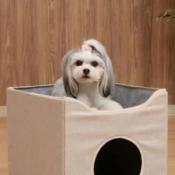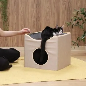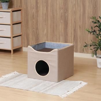 ルーフベット付きのペットハウスです。ルーフベッドまでは高さ30cmと低めの高さ設計で、飛び乗って遊ぶこともできます。直径18cmと広すぎない入口で、中の温められた空気をキープ。光が入りにくいので、日中でも暗くやすらげる場所を作れます。ハウスの内部とルーフベットにはふかふかした柔らかい質感のシートがついています。