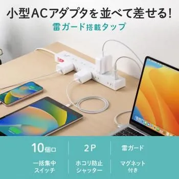 ■ラッピング(包装)対応不可です。 小型ACアダプタが差し込める(差込口ピッチ45mm)10個口電源タップ。iPadなどのタブレットの充電器接続に便利です。雷ガードを内蔵しており、恐ろしい雷から機器をガードします。雷ガード作動中確認ランプ付きです。一括集中スイッチ付きで、接続した機器の電源をまとめてON/OFFできます。ブレーカーを内蔵しており、許容量をオーバーした場合ブレーカーが作動し事故を防止します。 スチール机に仮固定できるマグネット付きです。差込口にはシャッターが付いており、異物混入やホコリ防止にも役立ちます。