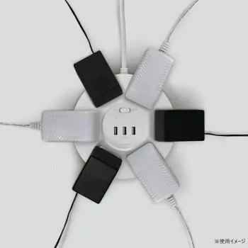 スマートフォンやタブレットを3台同時充電可能(USBポート)。雷から接続機器を守る耐雷サージ機能付。ブレーカー内蔵集中スイッチ。過電流を防止するブレーカー内蔵。ホコリ防止の扉付。コードは保護被ふく付安全構造。スッキリ配線できるL型プラグ。